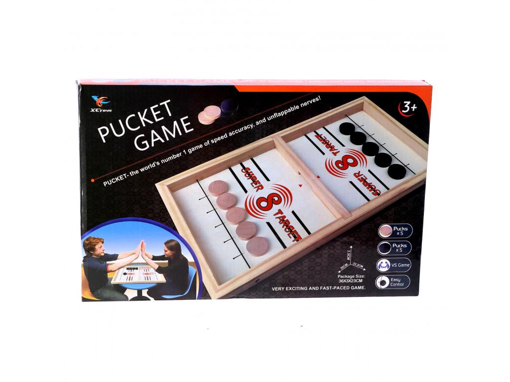 Játssz a Pucket játékkal! Ez a gyors és stratégiai játék ügyességet és gyorsaságot igényel, hogy a korongokat a kapukon keresztül lődd. Ideális barátok és családtagok számára, és tökéletes egy versenyszerű kihíváshoz. Holland nyelvű játék.
