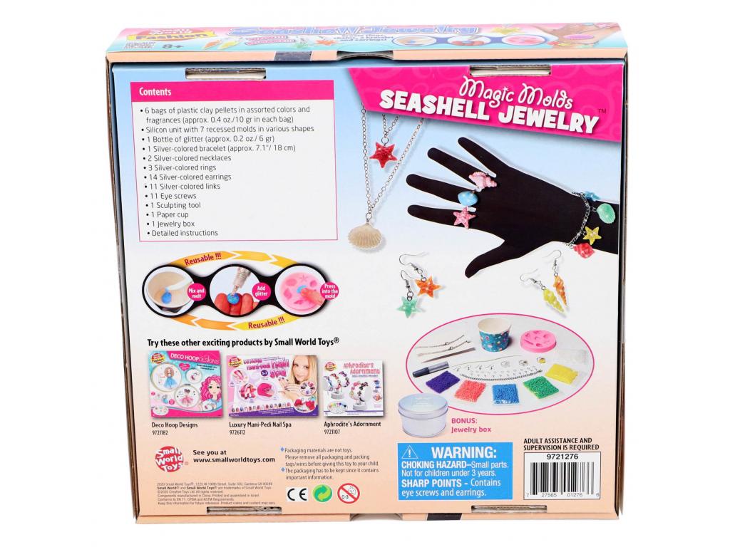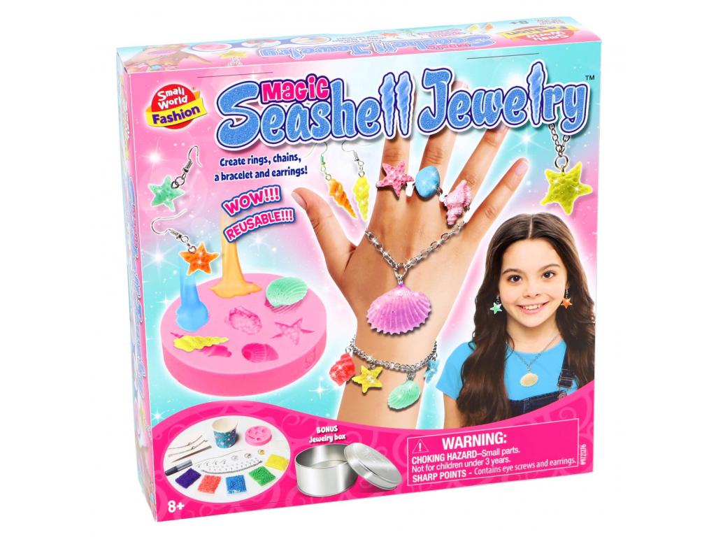 Ékszerkészítő szett kagylókból. Csomag gyönyörű ékszerek készítéséhez kagylóformák, csillámok, kövek és egyéb kedves díszek és kiegészítők segítségével. Tartalmaz tárolódobozt is az elkészített ékszerekhez. 8 éves kortól alkalmas.