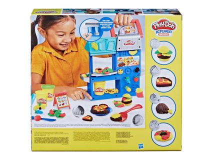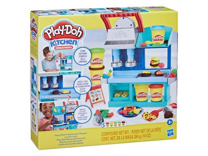 Ezzel a játékszetttel a gyerekek úgy érzik, mintha saját éttermet vezetnének: Play-Doh ételeket készítenek, változtatnak és osztanak meg képzeletbeli vendégekkel! A gyerekek könnyedén rögzíthetik a a formákat, és pizzát, hamburgert, tésztát vagy csirkét készíthetnek. Nyomd meg a kart, hogy egyszerre 2 ételt készíts! Amikor elengeded a kart, a tepsi átcsúszik a készítési állomásra! Készíts hamburger feltéteket, fantasztikus sült krumplit, vicces süteményeket és még több ételt a gyerekjáték mindkét oldalán található félformákkal. Helyezd őket a tányérra, és csúsztasd át az ablakon, hogy barátaid tudják, hogy a rendelés készen van! Engedd szabadjára a fantáziádat a mini menütáblával és egyéb konyhai kiegészítőkkel. Ez a főzőjáték 3 éves és annál idősebb fiúknak és lányoknak ideális ajándék azoknak a gyerekeknek, akik imádják a játék ételeket. 5 PLAY-DOH SZÍN: ez az asztali játékos ételszett 56 grammos piros, sárga, zöld, kék és barna Play-Doh gyurmát tartalmaz. Búzát tartalmaz. KÉZMŰVES JÁTÉKOK GYERMEKEKNEK: ez a konyhai játék 3 évesnél idősebb lányoknak és fiúknak ideális azoknak a gyermekeknek, akik szeretik a Play-Doh készleteket