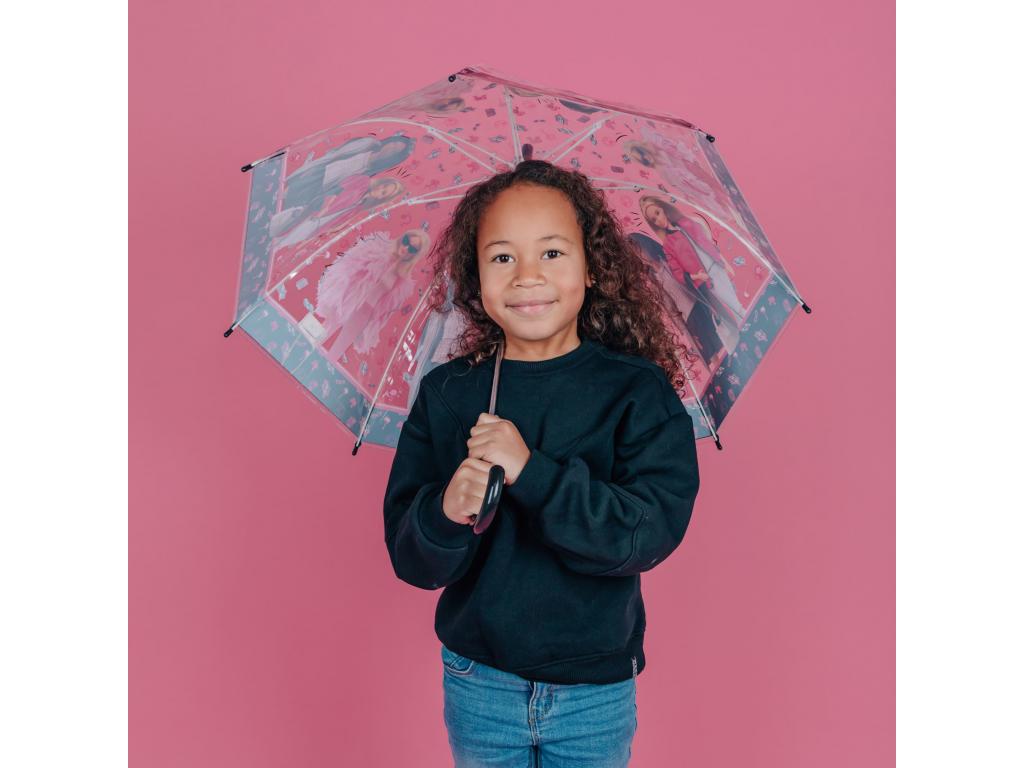 Divatos Barbie esőernyő, amelyen különböző Barbie-szereplők láthatók.