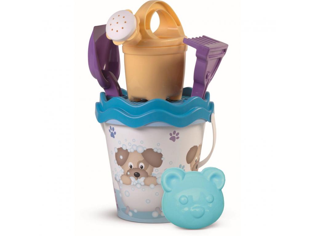 A strandon, a homokozóban vagy a kertben, ezzel a kiskutyás vödörkészlettel órákon át szórakozhatsz! A készlet egy vödörből, öntözőkannából, gereblyéből, lapátból, homokformából és egy szitából áll.