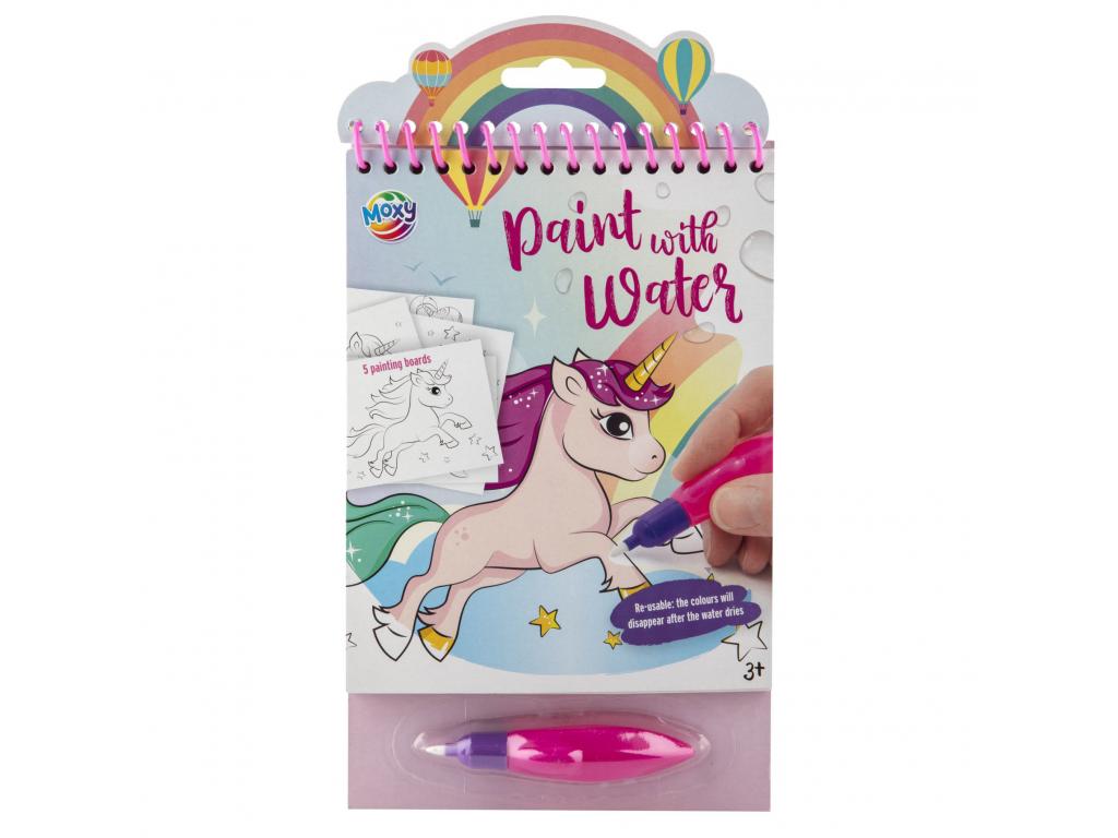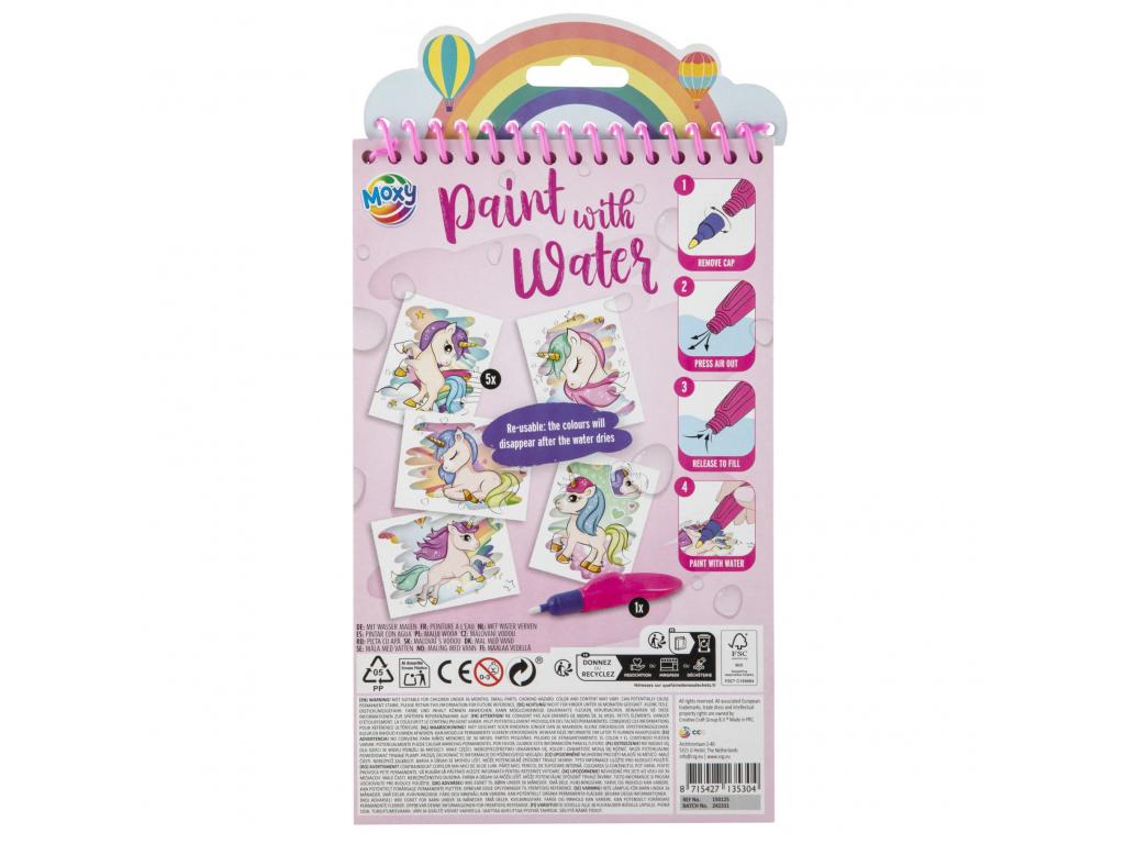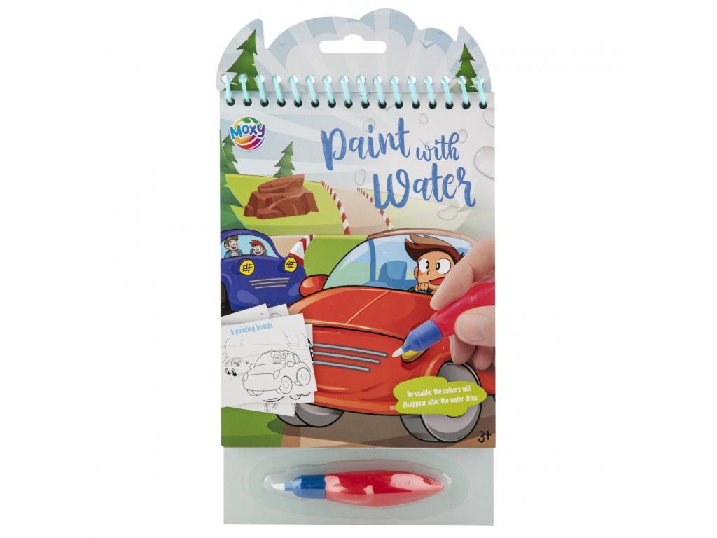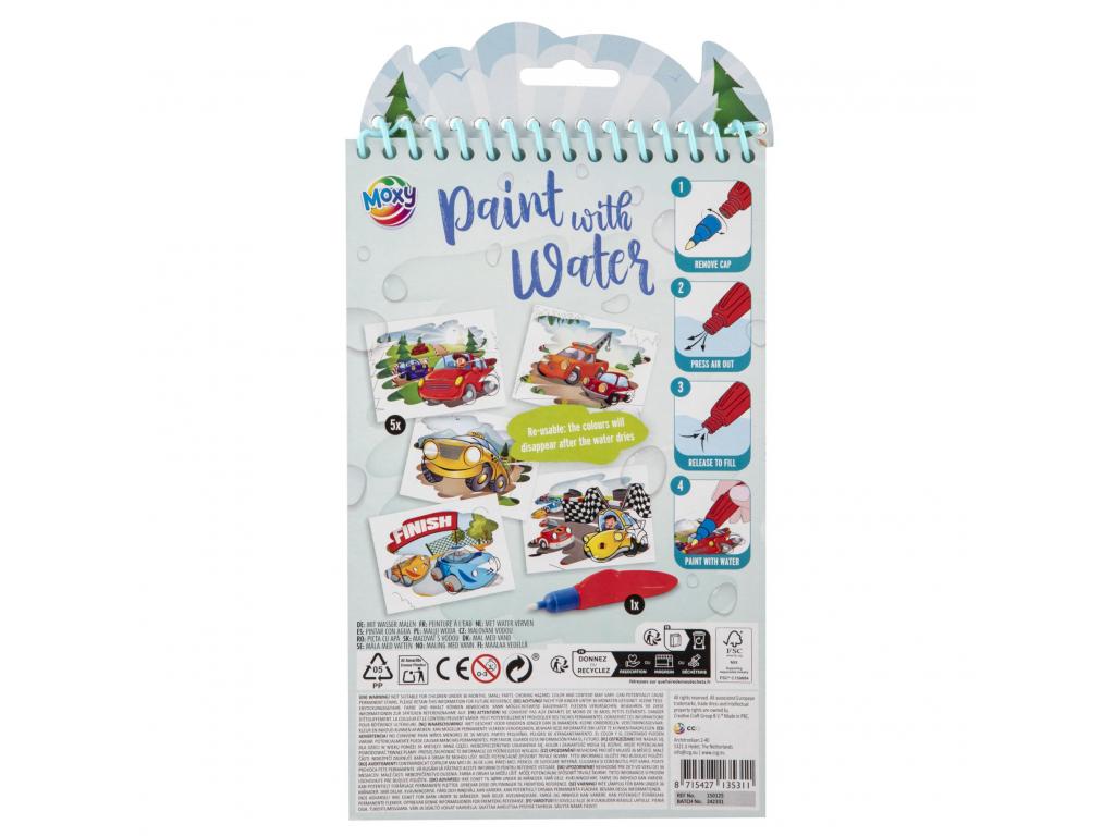 Vizes kifestő szett, 5 féle előre rajzolt sablonnal. A tollat töltsd fel vízzel, majd fesd ki a rajzokat! A víz hatására megjelennek a színek, ha a víz megszárad, eltűnnek, és elölről lehet kezdeni. 3 éves kortól.