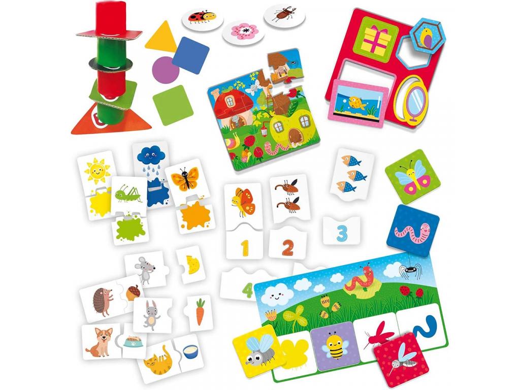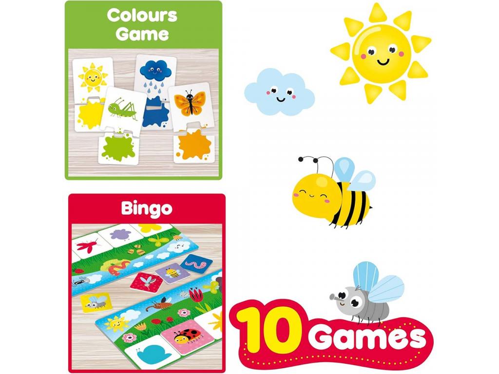 Ez a színes és vidám játékgyűjtemény tökéletes választás a 2 évesnél idősebb gyerekek számára, akik játékosan szeretnék felfedezni a világot. A csomag 10 különféle készségfejlesztő játékot tartalmaz, amelyek segítik a kicsik értelmi fejlődését, kézügyességét, logikai gondolkodását és szókincsét. A dobozban találsz formatornyot, kirakókat, árnyékkép- és memóriajátékot, keresős feladatokat, színegyeztetést, első számok játékot és még sok mást. Mindegyik játék egy-egy új élményt nyújt, miközben fejleszti a gyerekek különféle képességeit, legyen szó formák, számok, állatok vagy színek felismeréséről.
