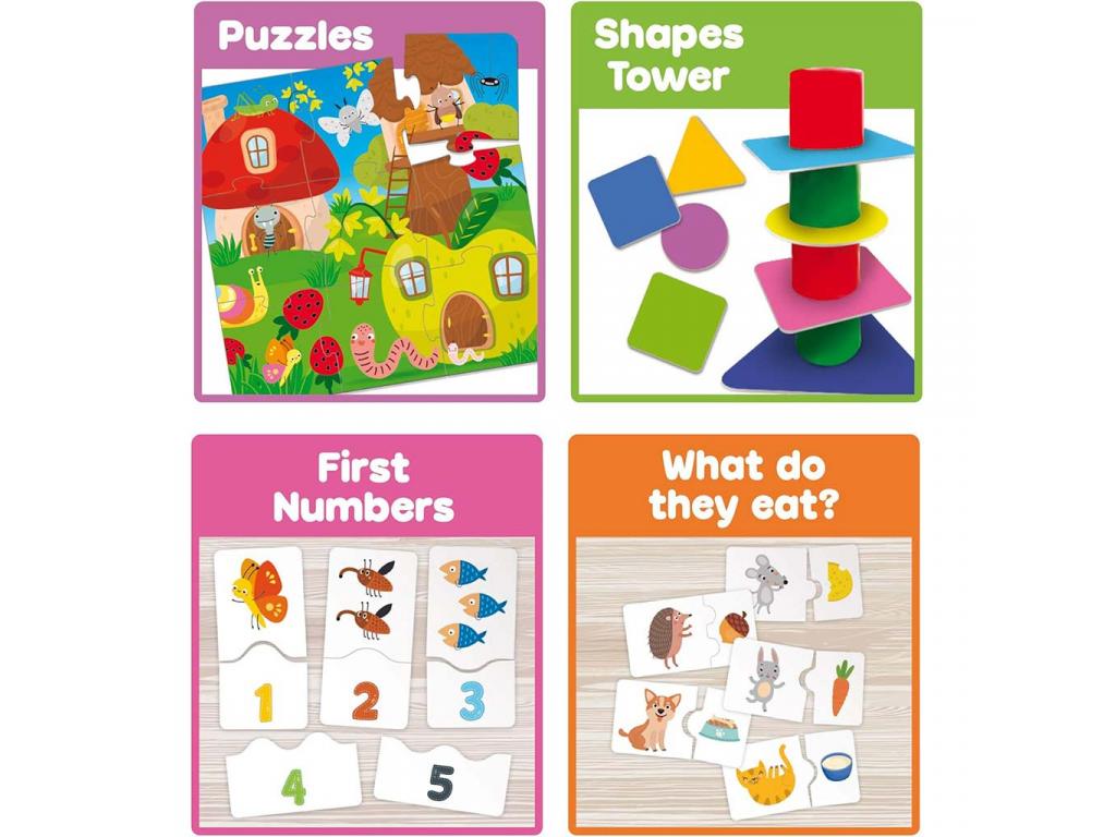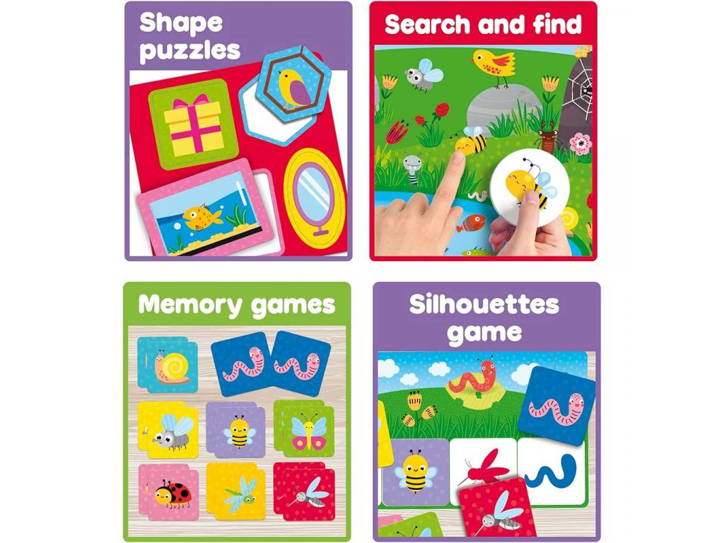 A szett játékai jól átláthatók, élénk grafikával készültek és strapabíró kartonból állnak, így biztonságosan használhatók akár kisebb kezek számára is. Remek lehetőséget ad közös játékra is, így a szülők aktívan bevonódhatnak a tanulásba. Használat közben a gyerekek játszva tanulnak pont úgy, ahogy a fejlődésükhöz a legjobb.