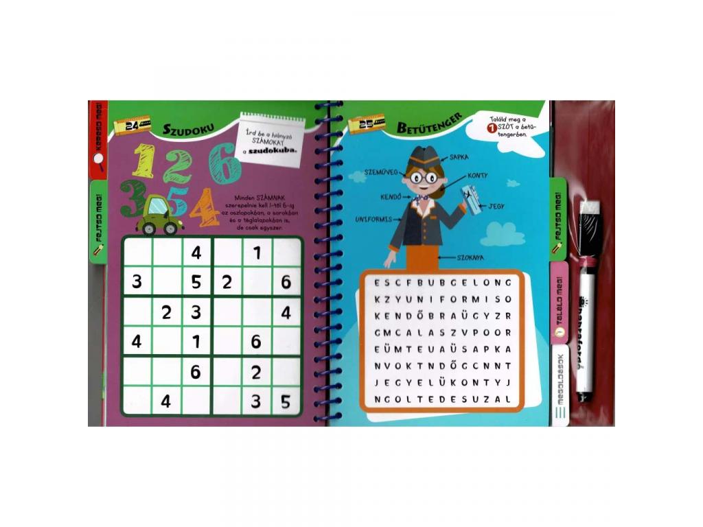 A spirálos kialakítás és a letörölhető filctoll lehetővé teszi, hogy a feladatokat újra és újra meg lehessen oldani, így a könyv hosszú távon is remek társ lehet bármely utazás során.