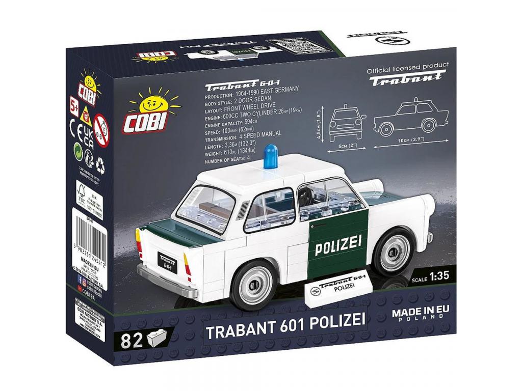 A Trabant 601 Polizei a COBI Youngtimer Collection része, mely a keletnémet autógyártás ikonikus modelljét mutatja be a rendőrségi változatban. Az építőjáték 1:35 méretarányban készült, autentikus fehér-zöld színvilággal és kék rendőrlámpával megjelenítve. A kész modell hosszúsága kb. 10 cm, szélessége 5 cm, magassága pedig 4,5 cm.