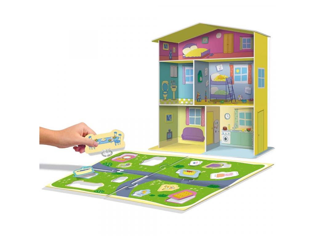 A gyerekek elhelyezhetik a különféle bútorokat és karaktereket a megfelelő szobákban, miközben fejlesztik finommotoros képességeiket és kreativitásukat is. Az erős kartonból készült elemek tartósak, könnyen kezelhetők, és rengeteg játékos lehetőséget kínálnak egy- vagy többgyerekes családoknak egyaránt. A 3D ház mellett található egy párosítós alapterület is, ahol a gyerkőc a házhoz tartozó tárgyakat rakhatja a megfelelő helyre így a tanulás még élvezetesebb!