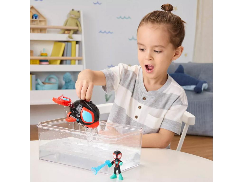 A szett főszereplője Miles Morales, azaz Spin, aki egy különleges delfin alakú víz alatti járműben indul bevetésre. A jármű egy gombnyomással kinyílik, és felfedi a pilótafülkét, ahová Spin figura könnyedén beültethető. A jármű propellere mozgatható, így valósághűbb vízi játékélményt nyújt. Ráadásul a jármű szemei hideg vízzel érintkezve megváltoztatják a színüket ez a kis extra garantáltan leveszi a gyerekeket a lábukról!