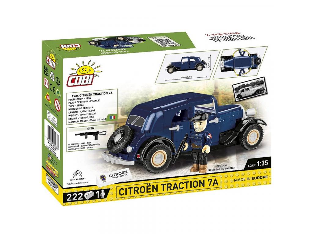 Az ikonikus 1934-es Citroën Traction 7A modell a front-hajtású autók úttörőjeként jelent meg Európában. Az első széria gyenge motorral készült, és mindössze három hónapig volt gyártásban (1934 áprilistól júliusig), ennek köszönhetően igazi ritkaságnak számít a gyűjtők körében. A COBI készlet 222 építőelemből állítható össze 1:35-ös méretarányban, hivatalos Citroën licenc alapján. A modellhez tartozik egy francia ellenállási harcos figura is, aki karján mozgalmi jelzést visel, valamint egy STEN géppisztollyal felszerelve érkezik. A részletgazdag kidolgozás, a nyomtatott mintázatok és a hiteles formavilág különlegessé teszik ezt az építőjátékot.