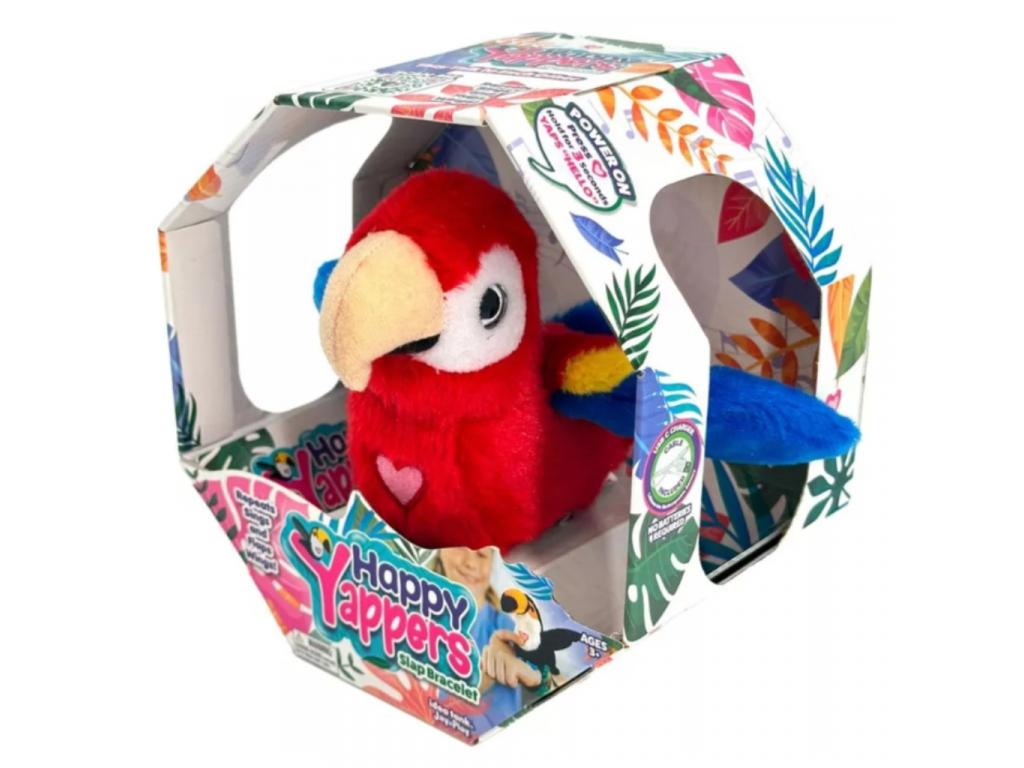 A Happy Yappers interaktív plüss piros papagáj egy vidám és különleges játék, amely életre kelti a gyerekek fantáziáját! Csak csapd a csuklódra a színes slap bracelet segítségével, és a papagáj mindig veled lesz. A mellkasán található szív megnyomásával elkezd ismételni, énekelni, csapkodni a szárnyaival, sőt, még más Happy Yappers figurákkal is tud beszélgetni! A játék mókás hangokkal és mozgásokkal szórakoztat, így a gyerekek könnyedén elmerülhetnek a játék világában. Ideális választás ajándéknak, hiszen egyszerre plüssfigura és interaktív társ, amely minden kalandot feldob. Hagyd, hogy a Happy Yappers piros papagáj berepüljön otthonodba, és kezdődhet a vidám, közös játék!