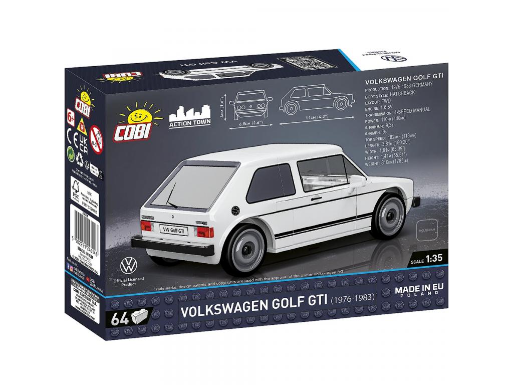 A COBI Volkswagen Golf GTI építőjáték a legendás hot hatch karakterét kelti életre építőkockákból. Az 1:35 méretarányú modell 64 darabból épül fel, és a jellegzetes szélesített sárvédők, a masszív gumibevonatos kerekek és a nagy orrspoiler egyaránt visszaadják az eredeti sportos megjelenését. A finom részleteknek, a tartós nyomtatott díszítéseknek köszönhetően egy letisztult és strapabíró modellt építhetsz meg matricák nélkül.