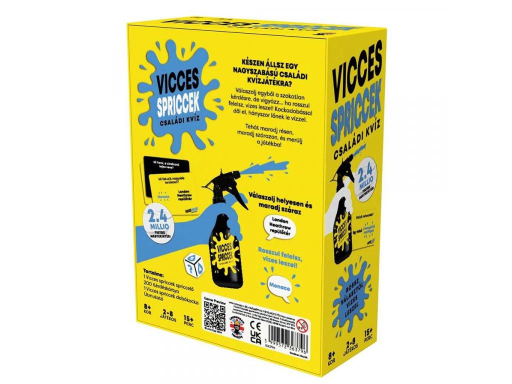 Készen álltok egy nevetéssel és fröcsköléssel teli kvízkalandra? A Vicces Spriccek családi kvízjáték garantáltan feldobja a közös estét de csak akkor maradsz szárazon, ha jól válaszolsz! Ez a pörgős és szórakoztató társasjáték ötvözi a kvízkérdéseket és a vízi tréfákat: ha rossz választ adsz, a többiek nem fognak kegyelmezni a spriccelő flakon rád irányul, és jön a vízes meglepetés!