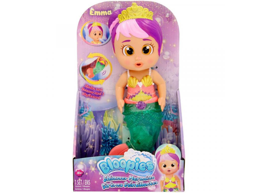 Emma, a Bloopies sellőbébi, igazi vízi tündérként varázsolja el a fürdőidőt legyen szó pancsolásról a kádban vagy játékos kalandokról a nyári medencében. Ez a bájos kis baba színpompás megjelenésével, mókás arckifejezésével és csillogó uszonyával garantáltan belopja magát a gyerekek szívébe. A Bloopies Shimmer Mermaid sorozat tagjaként Emma a fantáziadús fürdőjáték tökéletes kiegészítője már 18 hónapos kortól.