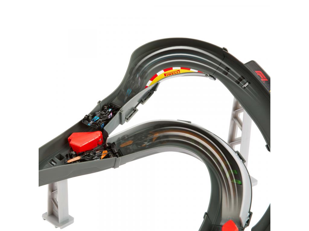 A szettben egy izgalmas, kétszintes versenypálya található, éles kanyarokkal és döntött ívekkel, amelyeken a kisautók szédítő sebességgel száguldhatnak végig. A rajt egy manuálisan működtethető, pumpás kilövő segítségével történik, amely nemcsak energiatakarékos (mert nem kell hozzá elem), de igazán élvezetes és látványos módja a versenyindításnak. A célvonal mellett egy valósághű kijelző található, amely még izgalmasabbá teszi a befutót.