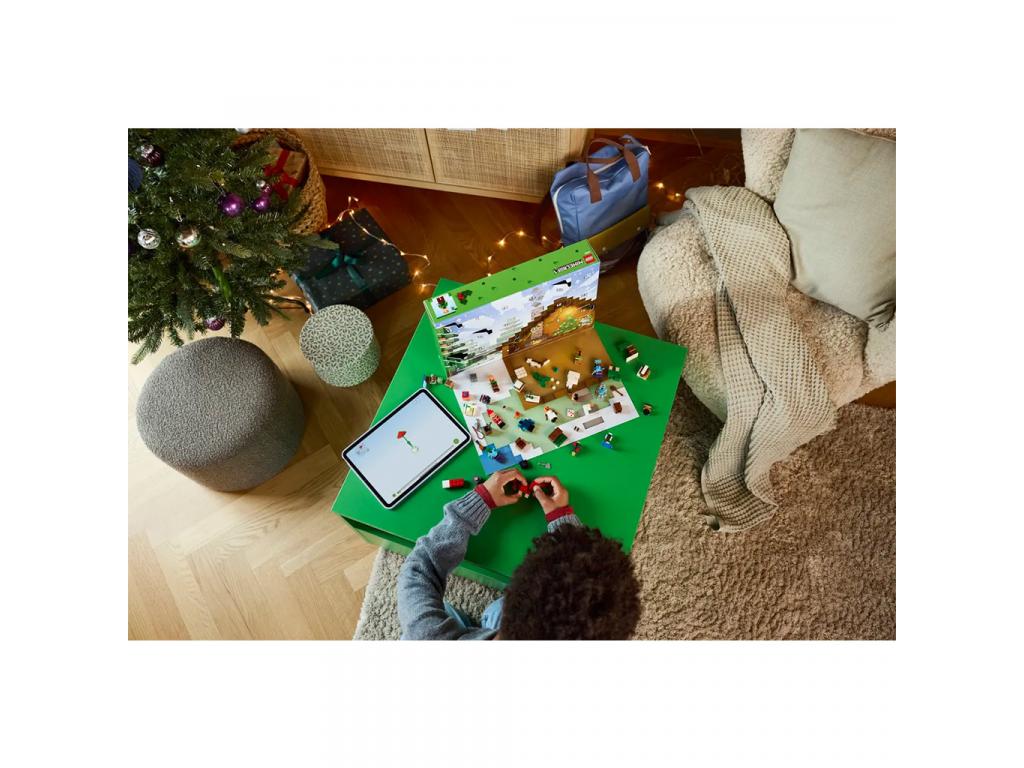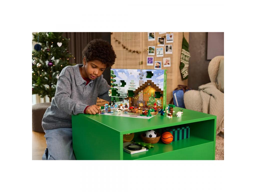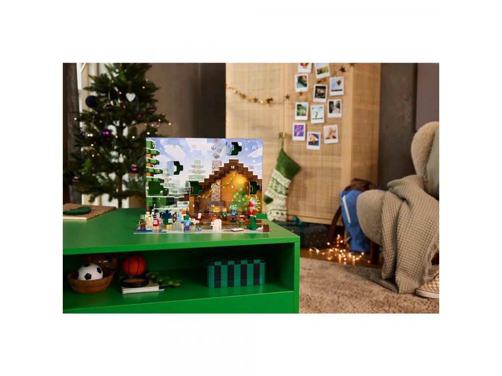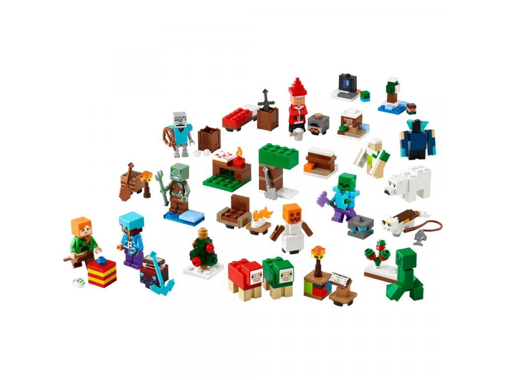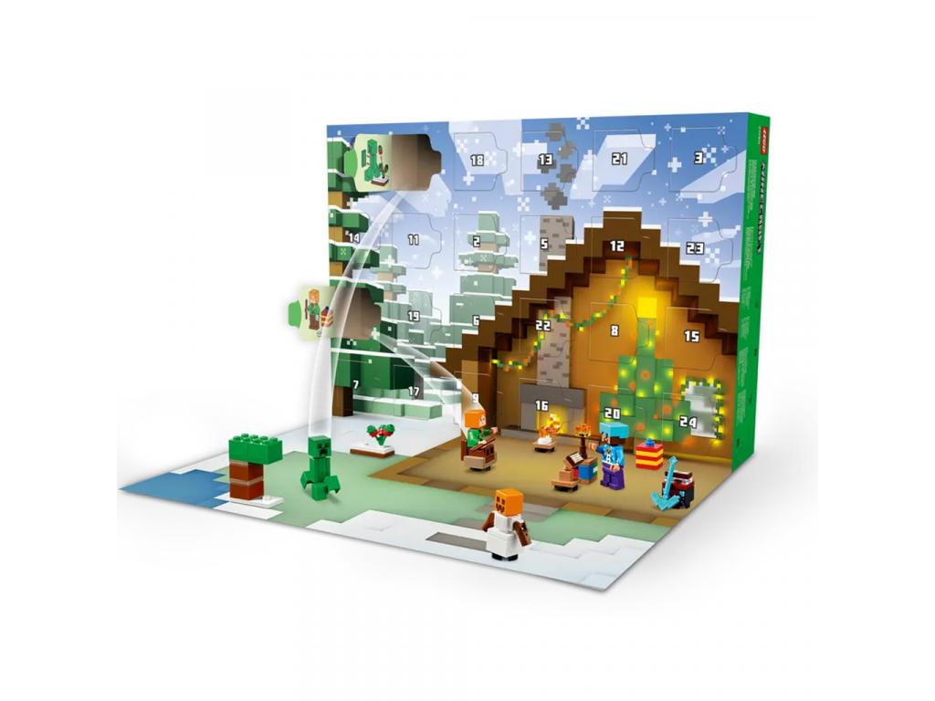 A 24 ajtó mögött agyerekek minden nap egy új ajándékot fedezhetnek fel a karácsonyi várakozás időszakában. A naptár a következő minifigurákat rejti: Alex, aki Creeper pulóvert visel; Steve, aki hóemberes pulóverben és gyémántsisakban tart egy csákányt a kezében; egy Cr eeper, aki egy édesbogyós bokor mellett áll, egy tengeri zombi szigonnyal; egy kóbor gyémántpáncélban; egy hógólem; egy zombi elvarázsolt fejszével; és egy Mikulás kemencével. Mellettük rengeteg kis építőjáték és vagány kiegészítő várja a gyerekeket, akik azonnal felismerik majd a népszerű videójáték elemeit. A nagy nap közeledtével a gyerekek kombinálhatják az ajándékokat, és egy kisméretű, Minecraft téli falu szettet rakhatnak össze, és rengeteg saját, fantáziadús kalandra indulhatnak, amelyekhez a kihajtható játékszőnyeg biztosítja a tökéletes hátteret.