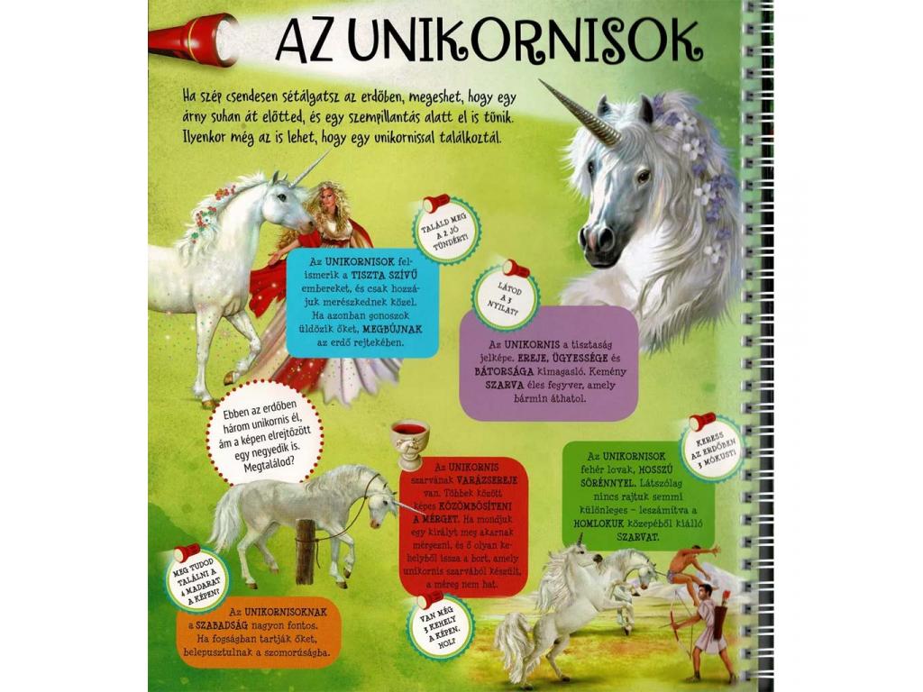 A Zseblámpával Az unikornisok nyomában című kötet igazi varázslatos kalandra hívja a gyerekeket. Szuper időtöltés a felfedezés, hiszen a mellékelt karton zseblámpával a kicsik bevilágíthatják az oldalakat, és felfedezhetik, milyen titokzatos lények rejtőznek a sötétben.