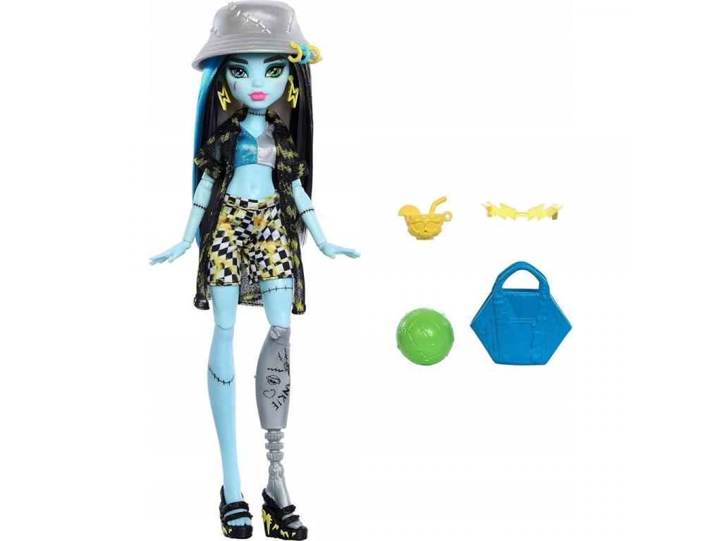 Frankie stílusa egyszerre vagány és bohókás: villám mintás felsője, kockás rövidnadrágja és lenge strandkabátkája igazán figyelemfelkeltő. Kiegészítőként kapott egy ezüst színű, varrásmintás bucket kalapot, villám alakú napszemüveget, strandtáskát, zöld labdát és egy szörnyitalos koktélt is ezek mind segítenek a gyerekeknek még kreatívabb történeteket kitalálni. A baba egyik lába különleges, mechanikus dizájnnal készült, ami nemcsak a karakter sajátossága, hanem egyedi megjelenést is ad neki.