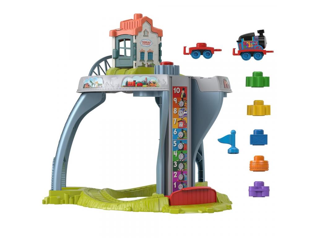 A készlethez egy tolós Thomas mozdony és kocsi tartozik, valamint több kiegészítő, köztük zászló, formák és fogaskerekek. Ezeket a gyerekek rakosgathatják, forgathatják, vagy a tehervagonba pakolhatják, ezzel fejlesztve finommotorikus készségeiket és kreatív történetmesélő képességeiket.