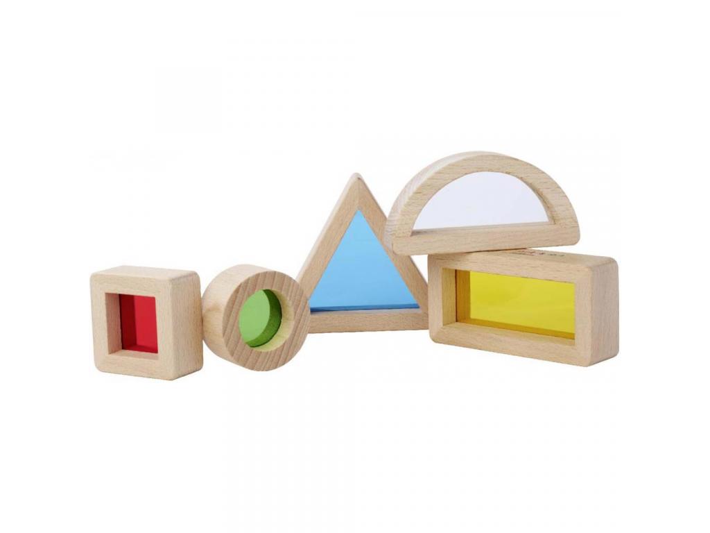 A készletben található különböző geometriai formák (kör, négyzet, háromszög, félkör és téglalap) élénk színű, áttetsző ablakokkal rendelkeznek, így a gyerekek nemcsak építeni tudnak velük, hanem megfigyelhetik, hogyan változik a fény, ha átvilágítják őket, vagy összeillesztik a különböző színeket. A színes "ablakok" nem papírból készültek, hanem strapabíró, áttetsző műanyagból, így valóban ellenállnak a kis kezeknek.