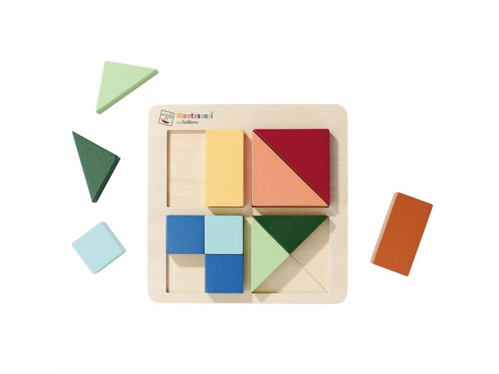 A készlet tartalmaz egy fa tálcát, amelyen négy különböző formacsoport található: négyzetek, téglalapok, háromszögek és azok kombinációi. A színes elemeket úgy kell a gyerekeknek behelyezniük, hogy azok illeszkedjenek a megfelelő helyre ez nemcsak kihívás, de sikerélményt is ad, amikor egy-egy rész a helyére kerül.