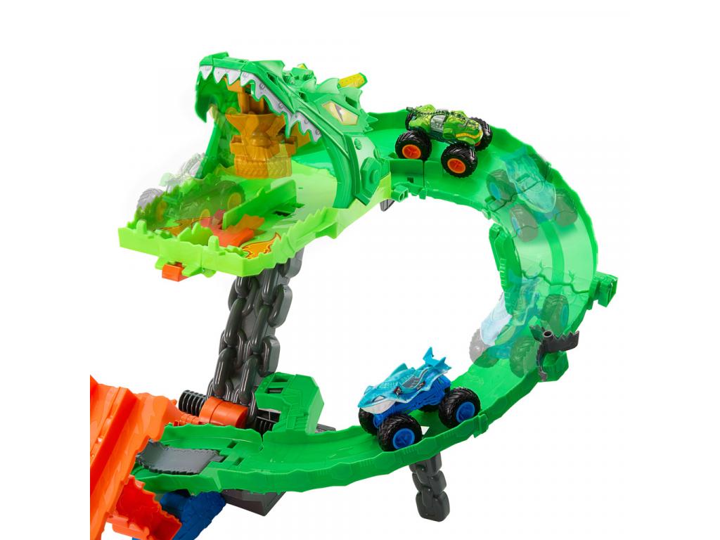 A készletben két exkluzív 1/64 méretarányú Monster Truck található: Great Bite és Rageasaur. A kocsik a pályán versenyeznek, miközben a láncfűrésszel felszerelt elágazó véletlenszerűen dönti el, melyik jármű kerül előnybe, és melyik száguld le a pályáról. A cél, hogy az egyik autó elérje a célvonalat, kiüsse a sárkányt, majd egy újabb lendülettel belecsapódjon a szörny szájába, hogy megszerezze a trófeát.