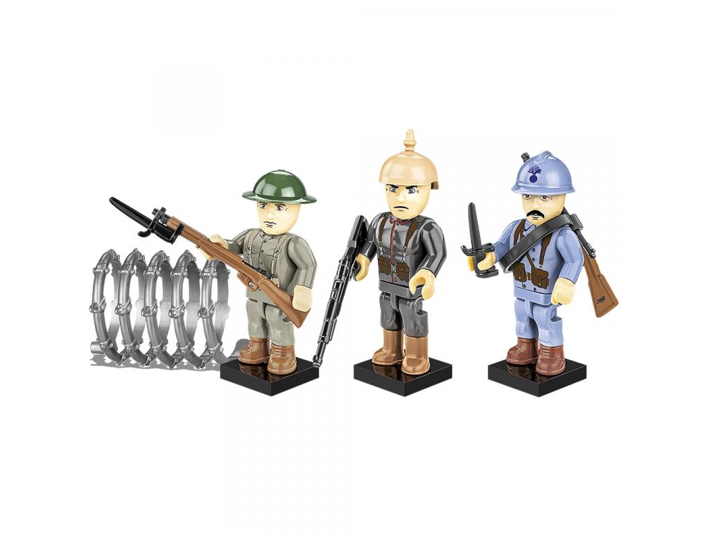 Utazz vissza az időben az első világháború legendás nyugati frontvonalára ezzel a történelmi COBI figura szettel! A készlet három részletesen kidolgozott katonát tartalmaz, akik a háborúban szembenálló nagyhatalmakat képviselik. A francia katona kék egyenruhát visel, és egy Lebel Mle 1886 puskával van felszerelve, melyhez bajonett is tartozik. A brit katona jellegzetes zöld egyenruhát és Lee-Enfield puskát kapott, amely szintén bajonettel egészül ki. A német katona ikonikus Pickelhaube sisakot visel, fegyvere egy Kar98k Mauser puska, ruházata és barna csizmája hűen tükrözi a korabeli katonai megjelenést.