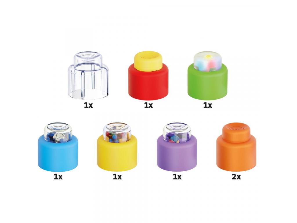 A kockák között találsz világító elemet (Light-up momy), csörgőt (maracas sound), csilingelő hangot adót (tinkle sound), madárhangot utánzó darabot (cip cip), illatos verziót (momy essence), valamint átlátszó, színes gyöngyökkel teli elemeket is. Ezek a különböző hatások nemcsak szórakoztatják a babát, hanem segítik az érzékszervek fejlődését, javítják a kéz-szem koordinációt, és ösztönzik a felfedezést.
