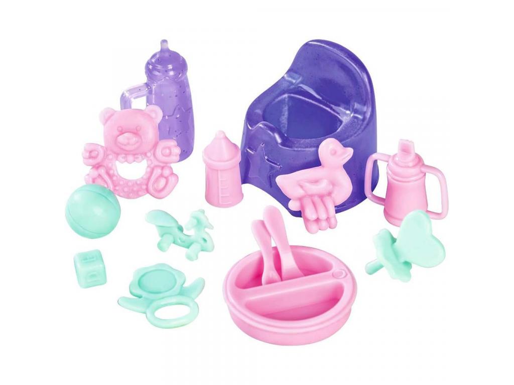 A 2 az 1-ben bölcső különleges funkciót tölt be: használható babahordozóként és kiságyként is. Ez lehetővé teszi, hogy a gyerekek változatos játékhelyzeteket alkossanak. A több mint 15 darabos kiegészítő szett mindent tartalmaz, amire egy kisbaba neveléséhez szükség lehet: cumisüveg, bili, játékok, rágóka, tányér, kanál, pelenkás kellékek és sok más apróság.