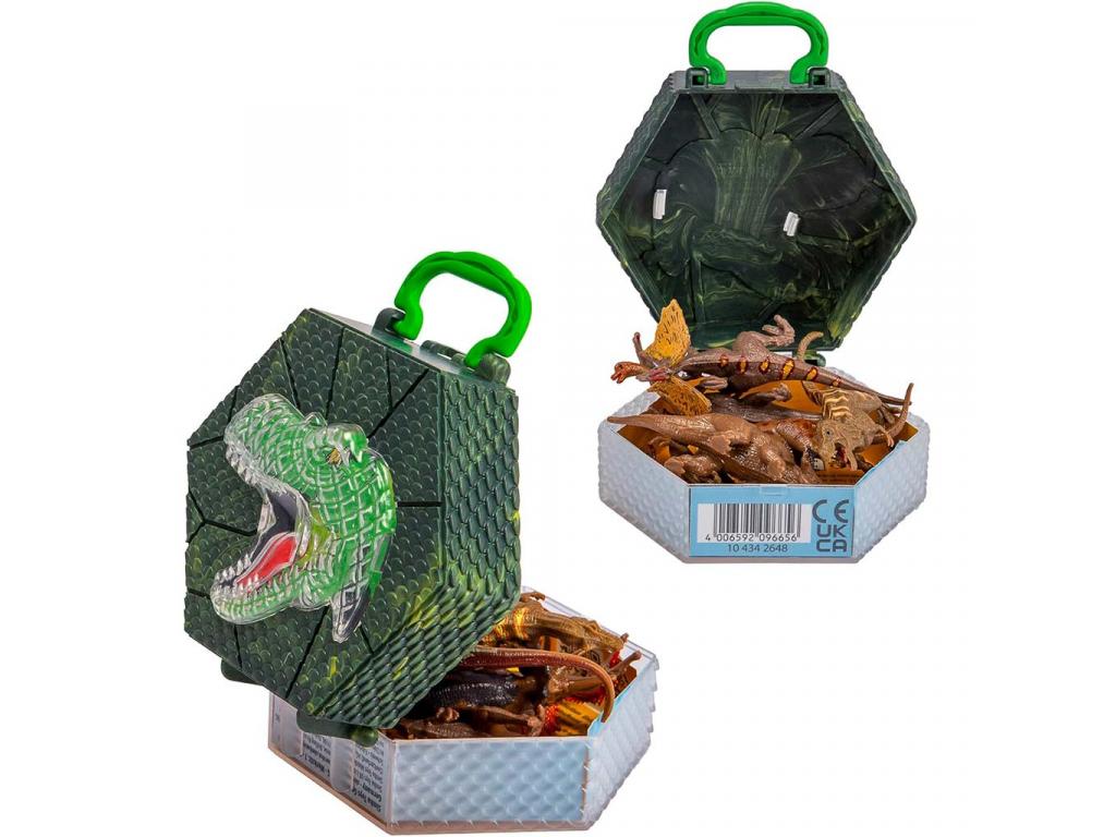 A dínós minta borítású, strapabíró hordozódoboz belsejében 6 különböző dinoszaurusz figura rejtőzik, amikkel azonnal indulhat a játék. Tyrannosaurus Rex, Stegosaurus, Triceratops és még sok más őslény vár arra, hogy gyermeked elindítsa saját jurakori világát. A figurák részletes kidolgozásúak, kézbe illő méretűek, így kiválóak szerepjátékra, történetmesélésre vagy akár gyűjtögetésre is.