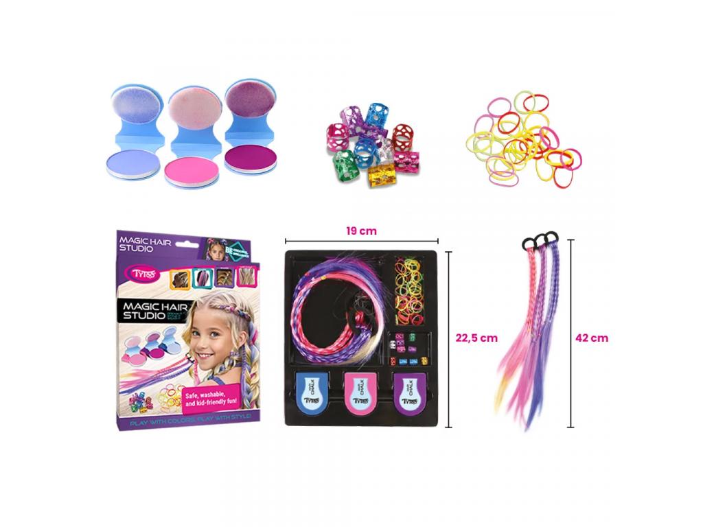 A Magic Hair Studio több mint egy egyszerű játékkészlet ez egy komplett mini szépségszalon színes hajkrétákkal, csillogó hajgyűrűkkel, fonható póttincsekkel és vidám színű hajgumik tömegével. A 3 darab hajkréta (rózsaszín, lila, világoskék árnyalatban) biztonságos, bőr- és hajbarát formulával készült, így könnyedén felvihetők és ugyanilyen gyorsan kimoshatók egy hajmosással. A póttincsek szivárványszínben pompáznak, tökéletesen illenek a kis fonásokba vagy copfokba.