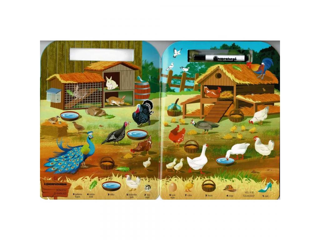 A könyvben szereplő képeken állatok, tárgyak és a tanyasi élet mindennapjai elevenednek meg. A gyerekek feladata, hogy a mellékelt filctoll segítségével megtalálják és bekarikázzák a megadott elemeket. A játék nemcsak szórakoztató, hanem fejleszti a megfigyelőképességet, a koncentrációt és a vizuális észlelést is.