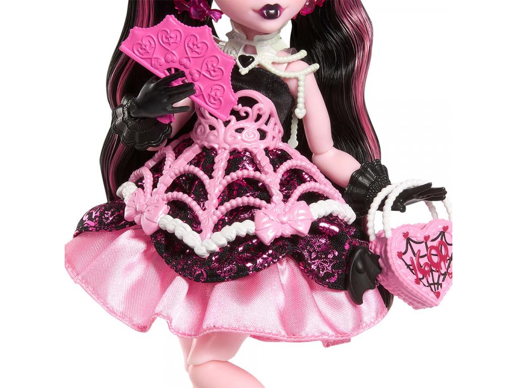 Draculaura ezúttal egy látványos, fekete-rózsaszín flitteres és selyemhatású ruhában ünnepel, amit pókhálómintás műanyag fűző díszít pont, ahogy egy vérbeli szörnydivatdiktátorhoz illik! Hozzá illő kiegészítők, mint a szív alakú táska, a különleges legyező, a masnikkal és gyöngyökkel díszített magas sarkú cipők, valamint a denevérszárnyas hajdísz csak tovább fokozzák a karakter varázsát.