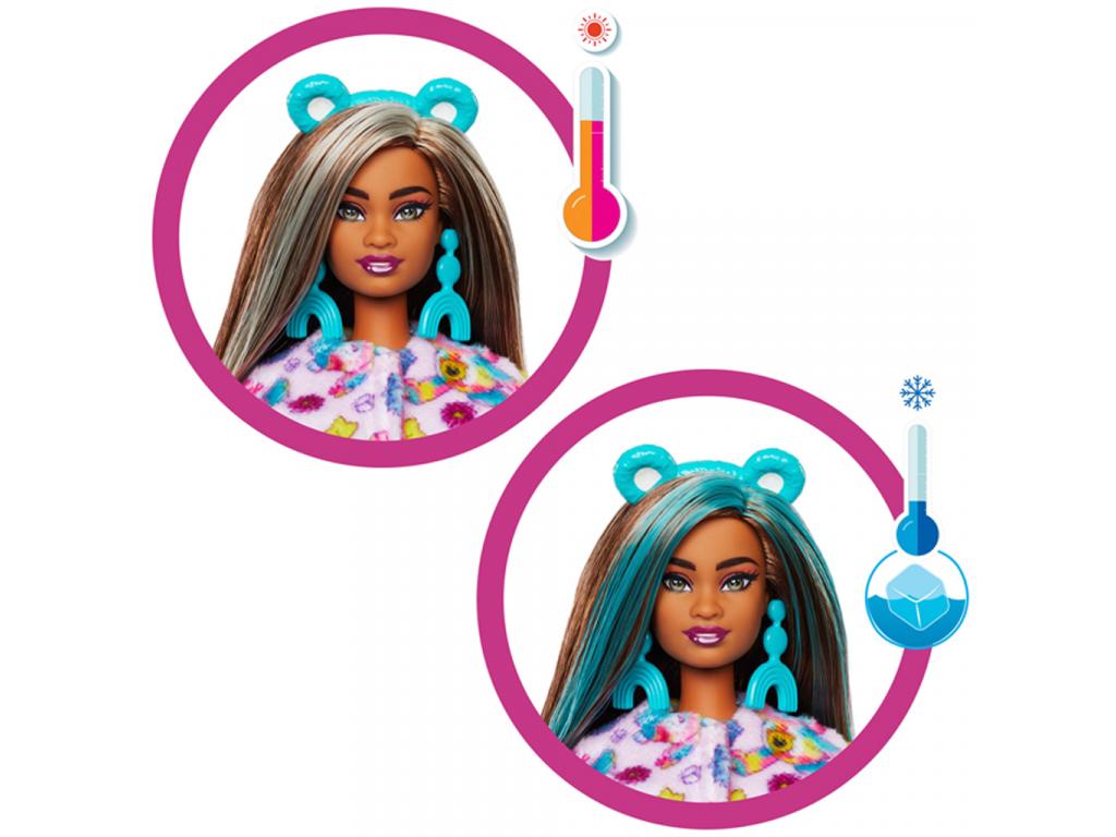 A csomagolás egy különleges henger, amelyben egy szivárványszínű, pihe-puha Good Vibes Bocs jelmezes Barbie rejtőzik. Ahogy a gyermek kibontja a figurát, egy igazi varázslat kezdődik: a bocs fejrésze levehető, és alatta egy trendi Barbie baba bukkan elő. A baba hőre változó hajtincsekkel és arcfestéssel rendelkezik csak egy kis hideg vagy meleg víz kell hozzá, és máris átalakul a külseje!
