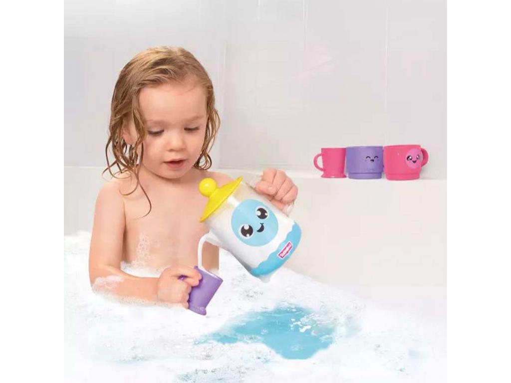 A készlet egy vidám, mosolygós teáskannából és 3 színes bögréből áll, amelyeket kifejezetten a kis kezekhez terveztek. A kanna speciális pumpás mechanikával működik csak tegyetek bele egy kis fürdőhabot és vizet, majd nyomjátok meg a gombot, és már készül is a habtea! A kanna habot önt ki, amit a bögrékbe lehet adagolni, így a gyerekek igazi teapartit rendezhetnek a kádban.