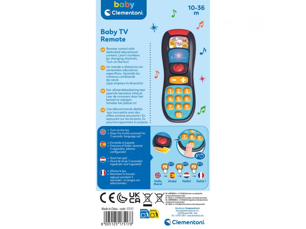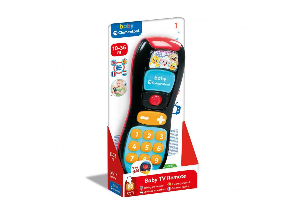 A Clementoni bébi távirányító színes gombjaival és hanghatásaival leköti a babát, míg a felnőttek tévéznek. A játék közben még a aszámokat is segít megtanulni, különböző nyelveken: angol, spanyol, francia, holland. 10-36 hónapos korban ajánlott.