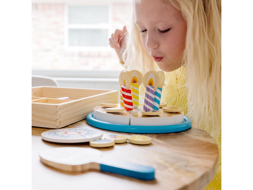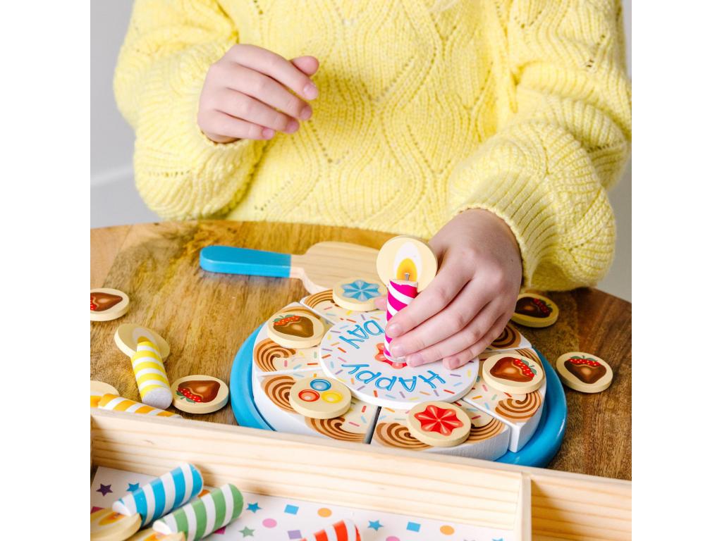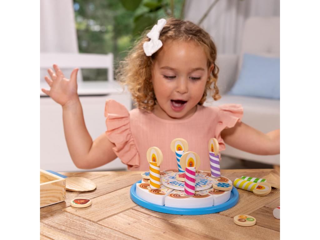 Ideje tortát enni! Elevenítsd meg a születésnapok varázsát minden nap újra. Ezzel a gyönyörű fa születésnapi tortával a Melissa & Doug-tól gyermeked végtelenül ünnepelhet, vendégeket hívhat meg és gyertyákat fújhat el. Akár egy képzeletbeli plüssállat születésnapját ünneplik, akár csak egy hangulatos teázást tartanak tortával a menün... garantáltan felejthetetlen ünnepség lesz.