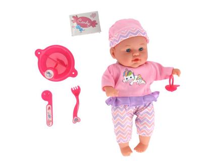 Baba 31 cm 4 hang + 5 kiegészítő. Egy gyönyörű baba a Mother Love-tól. A baba 31 cm magas és 4 különböző hangot ad ki. A baba és aranyos rózsaszín ruhája mellett a csomag 5 kiegészítőt is tartalmaz. A tányér, a villa, a kanál és a cukorkás doboz segítségével a baba soha nem lesz éhes. Ha megette a vacsoráját, adhatod neki a cumit. 2 éves kortól alkalmas.