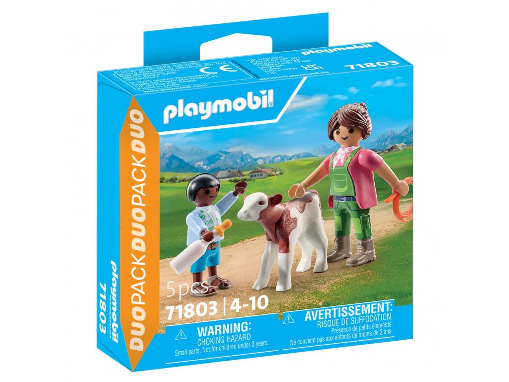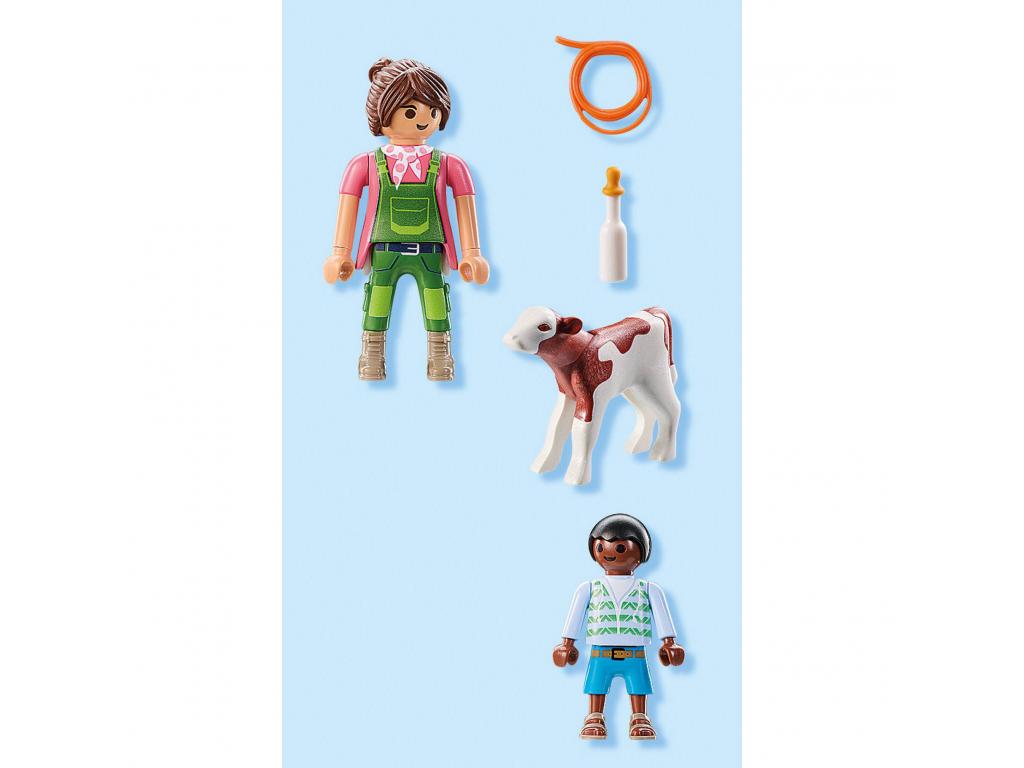 PLAYMOBIL DuoPack farmerrel, gyermekkel és borjával. A gyermek tejjel eteti a borjat. A farmer ügyel arra, hogy a fiú mindent helyesen csináljon.
