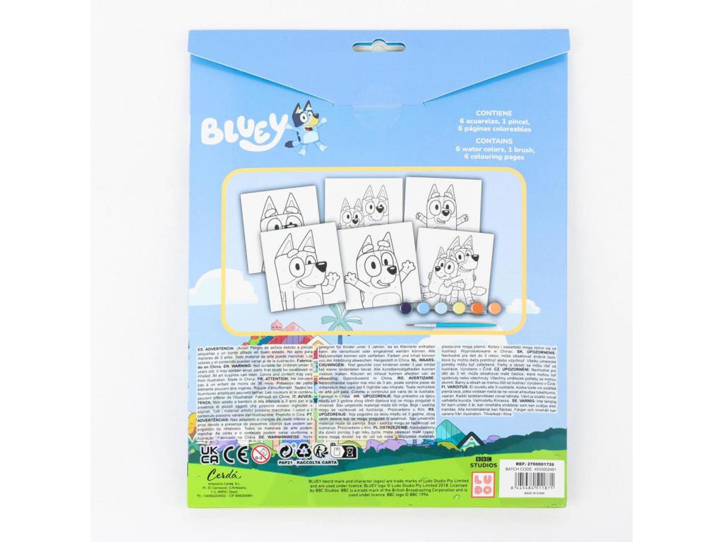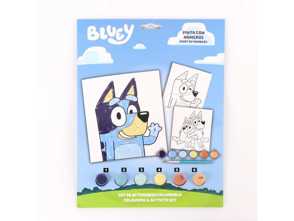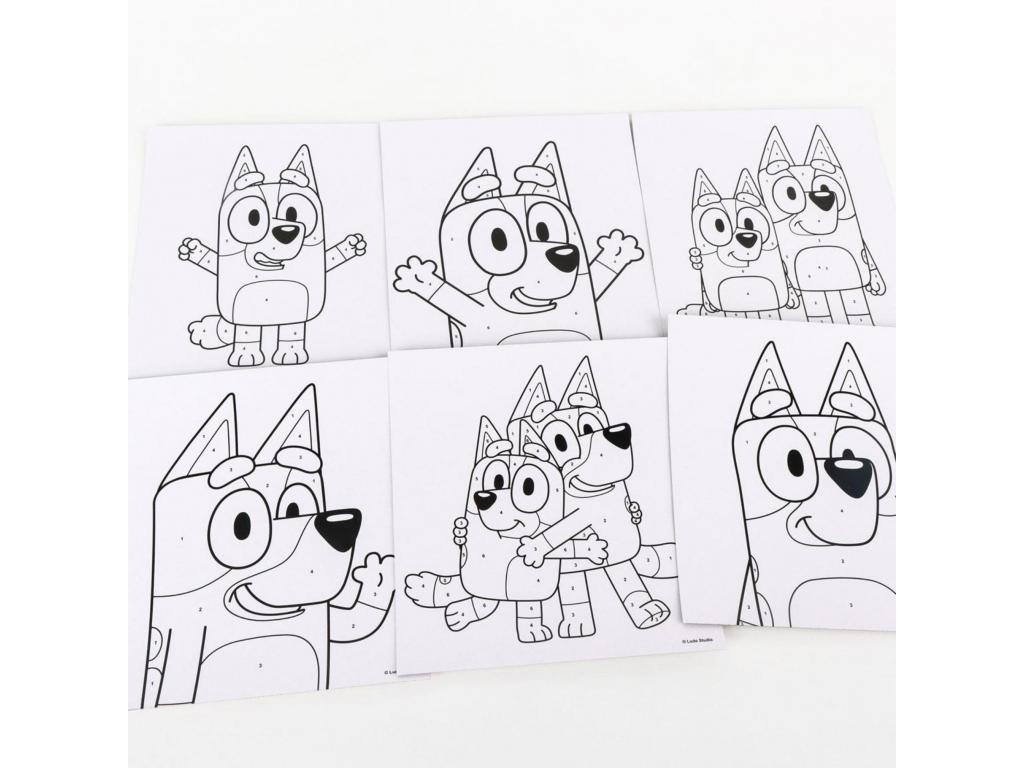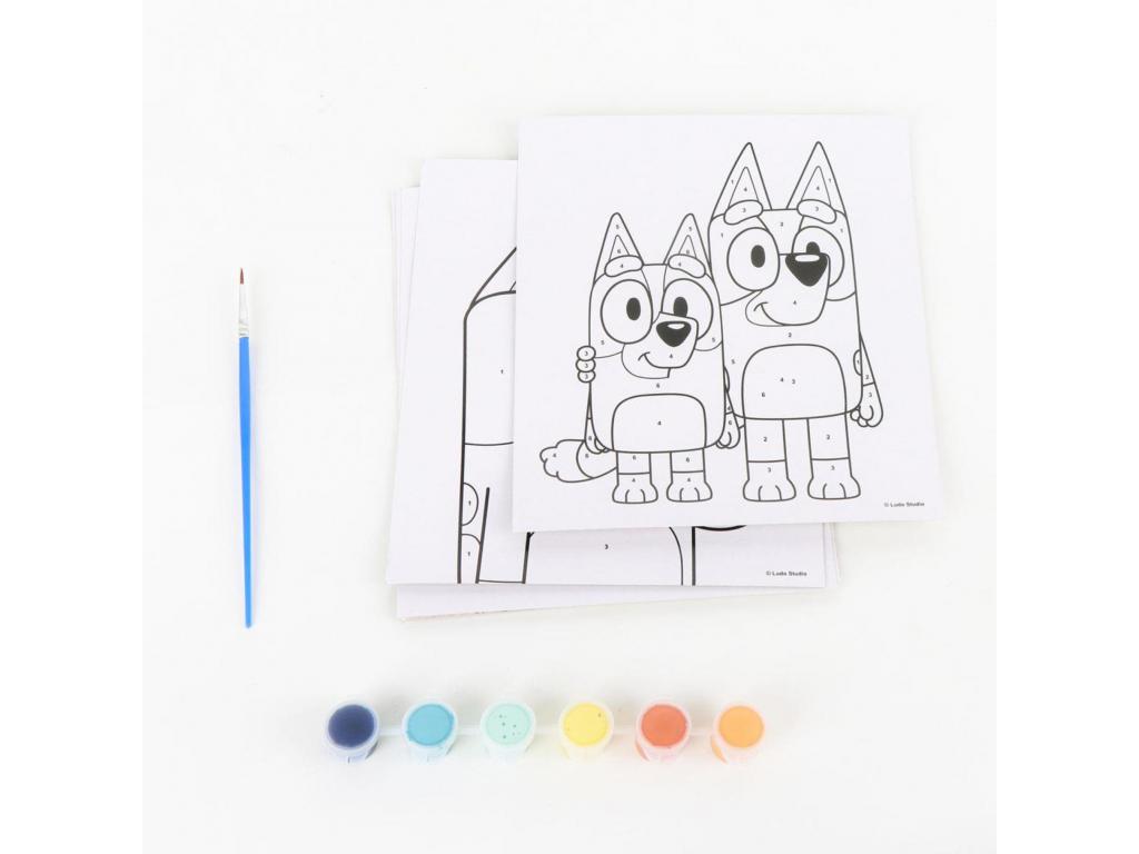 Fesd meg Bluey-t ezzel a festőszettel! Tartalma: 6 féle számozott festősablon, ecset és 6 vízfesték.