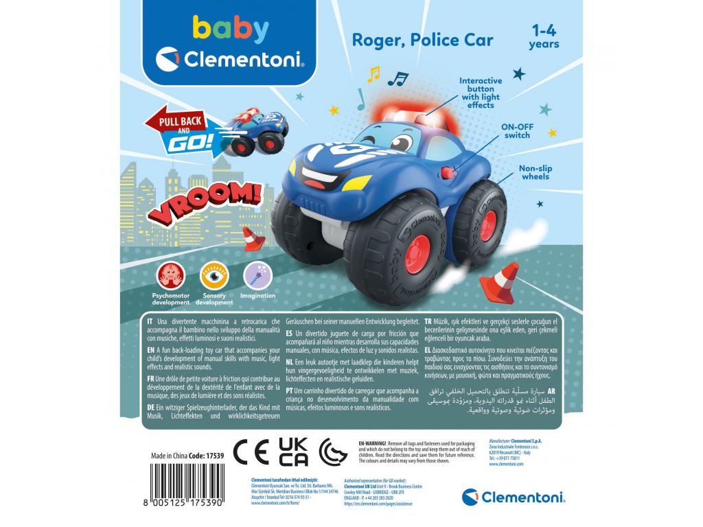 Nagy rendőrautó a Clementoni Baby-től. Könnyű, robusztus kialakítás kisgyerekek számára, lendkerekes funkcióval. 10 hónapos kortól alkalmas.