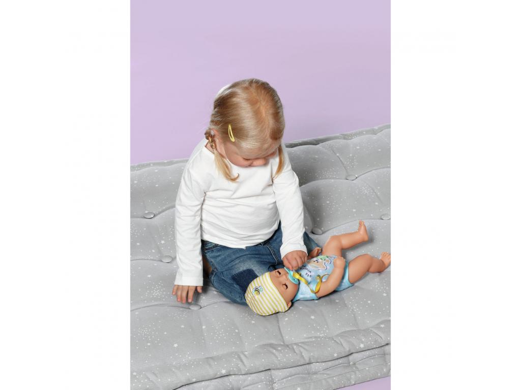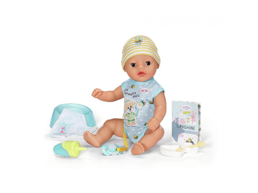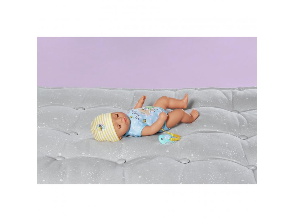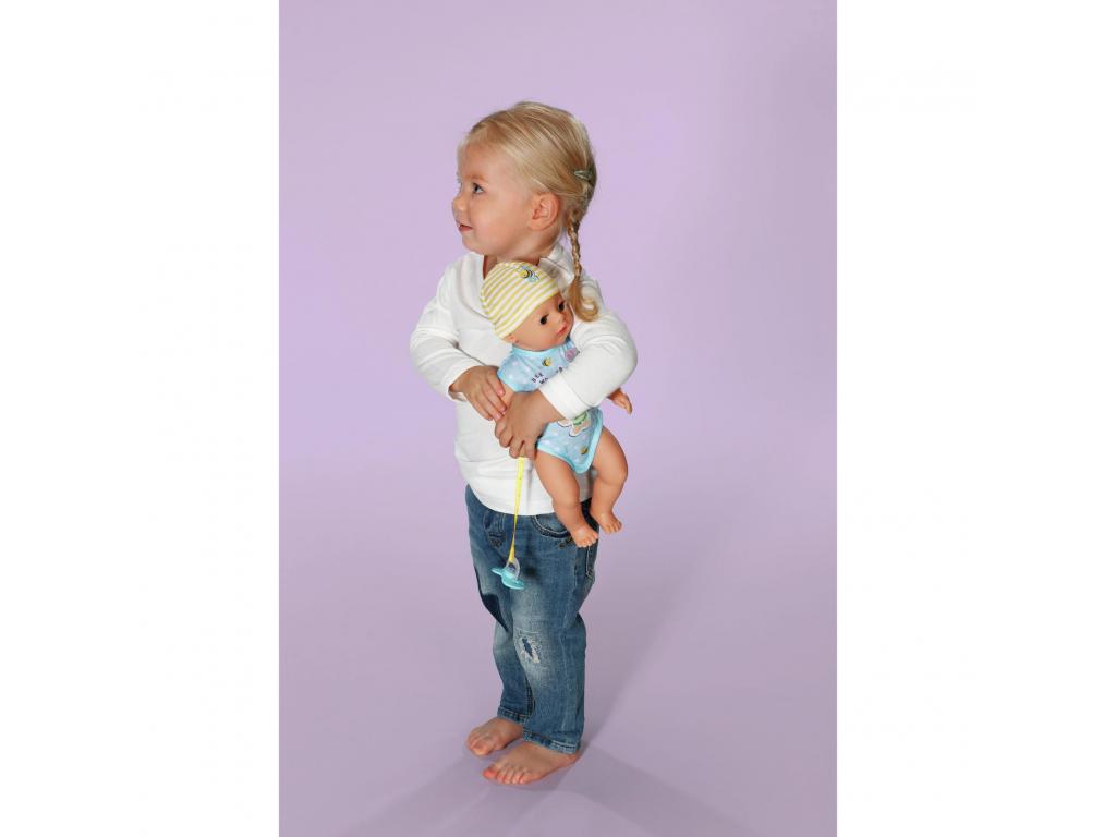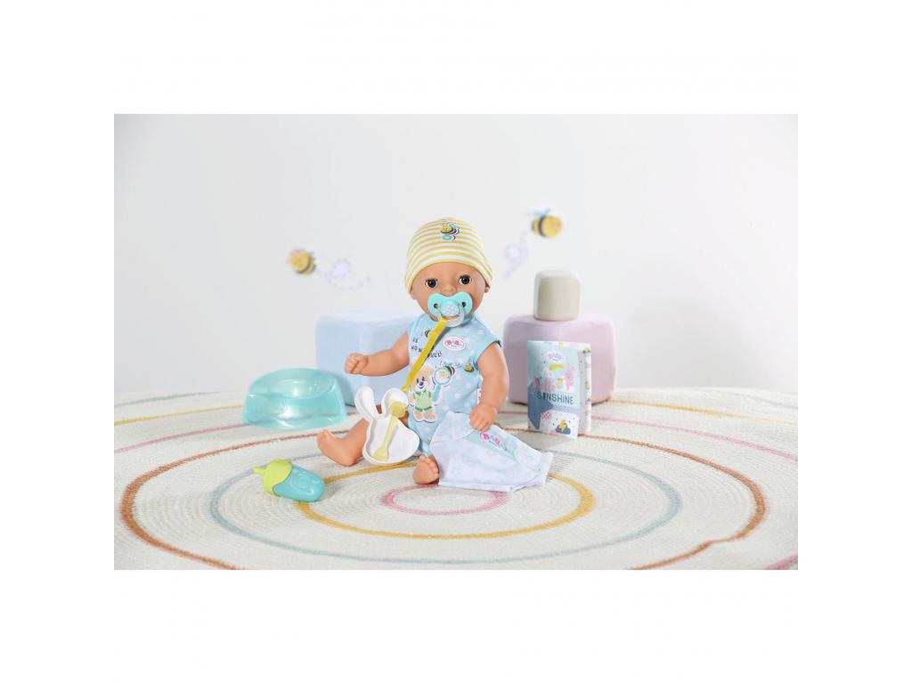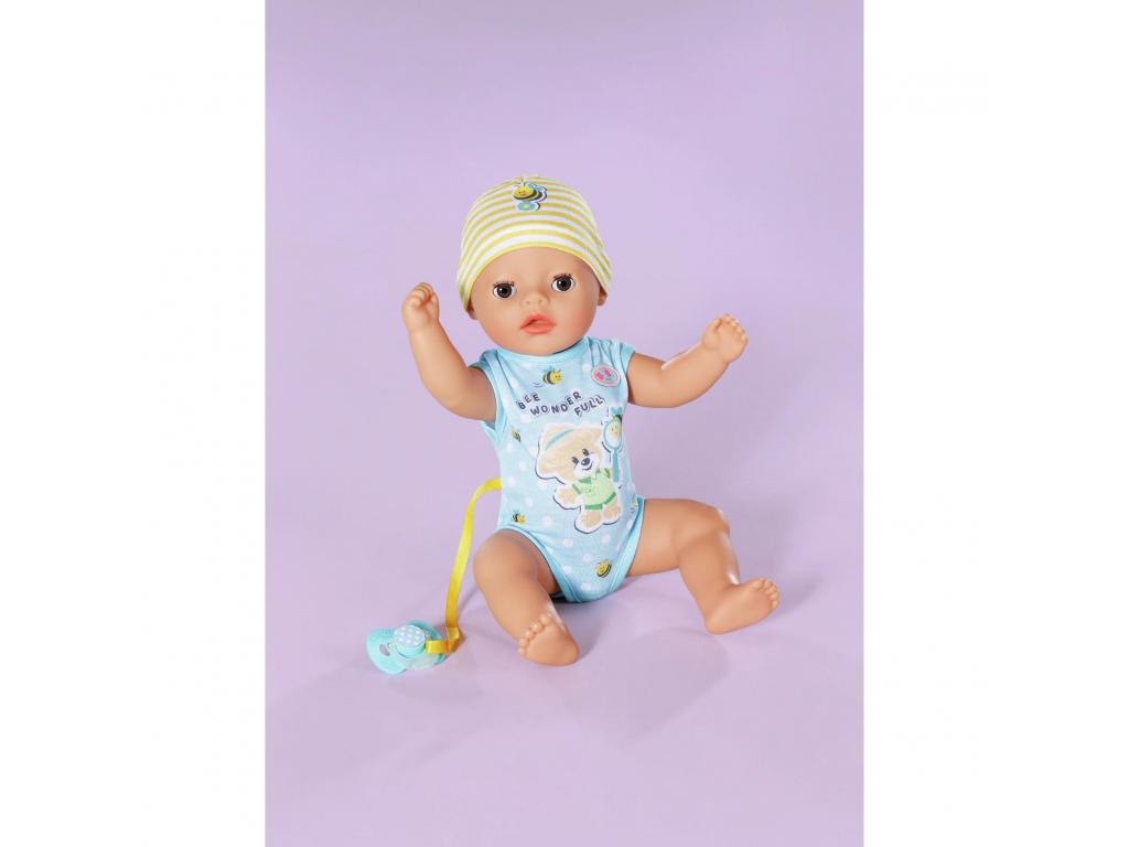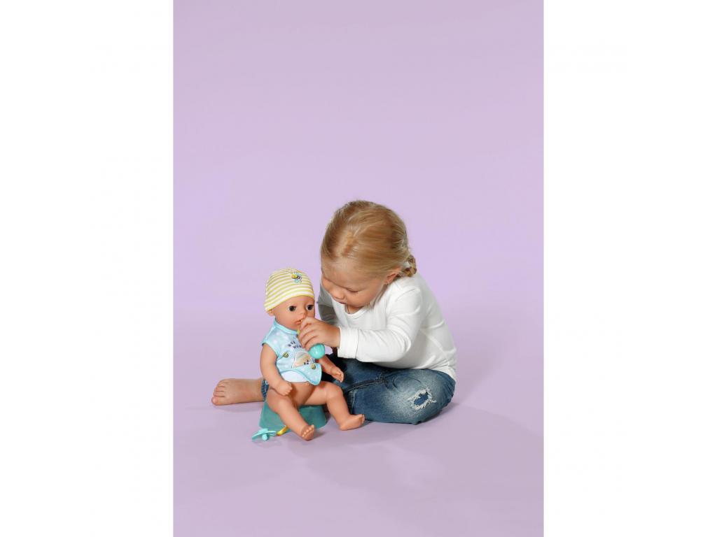 A BABY born Little fiú baba 7 fantasztikus funkcióval rendelkezik, amelyek mindegyike elemek nélkül működik. Minden szükséges dologgal ellátott. Ihat a cumisüvegéből, a rózsaszínű bilire ülhet, és pelenkázhatod is. Ha a testéhez rögzített cumit a szájába teszed, a szemei varázslatos módon kinyílnak vagy bezárulnak. Ha odaadod neki a cumit, és balra fordítod, akkor becsukja a szemét. Ha jobbra fordítod, akkor kinyitja a szemét. De ha lefekteted az ágyába szundikálni, akkor cumi nélkül is becsukja a szemét. Karjai, lábai és feje nagyon rugalmasak, így az öltöztetés és a levetkőztetés gyerekjáték. 36 cm-es magasságával alkalmas 1 éves kortól kezdve a kisebb gyermekek kezébe. Ez a tökéletes baba, amellyel először lehet változatos játékokat játszani, mintha egy igazi baba lenne. Gyermeke akár a babával együtt is ülhet a bilire, hogy játékosan megtanulja a szobatisztaságot.- Tökéletes kezdő baba a kicsiknek: a 36 cm-es BABY born Little baba kisebb mérete és alacsonyabb súlya miatt 1 éves és annál idősebb kisgyerekek számára alkalmas.- Varázslatos szemek: ha elfordítod a testéhez rögzített cumit, a baba szemei varázslatos módon kinyílnak és bezárulnak. - 7 korosztálynak megfelelő funkció: a BABY born Little tud inni, pelenkába pisilni, bilire menni, fürdeni és aludni. Rendkívül rugalmas, és varázslatos cumival rendelkezik. A kisgyerekek is könnyen tudnak játszani az összes funkcióval.- Elem nélkül működik: a BABY born Little fiú baba teljesen mechanikus, ezért fürdőbe is vihető. - Tartalmazza: 36 cm-es BABY born Little játékruhával, sapkával, bilivel, 1 textil pelenkával, 1 cumisüveggel, 1 tányérral és kanállal, 1 cumival és 1 születési anyakönyvi kivonattal.