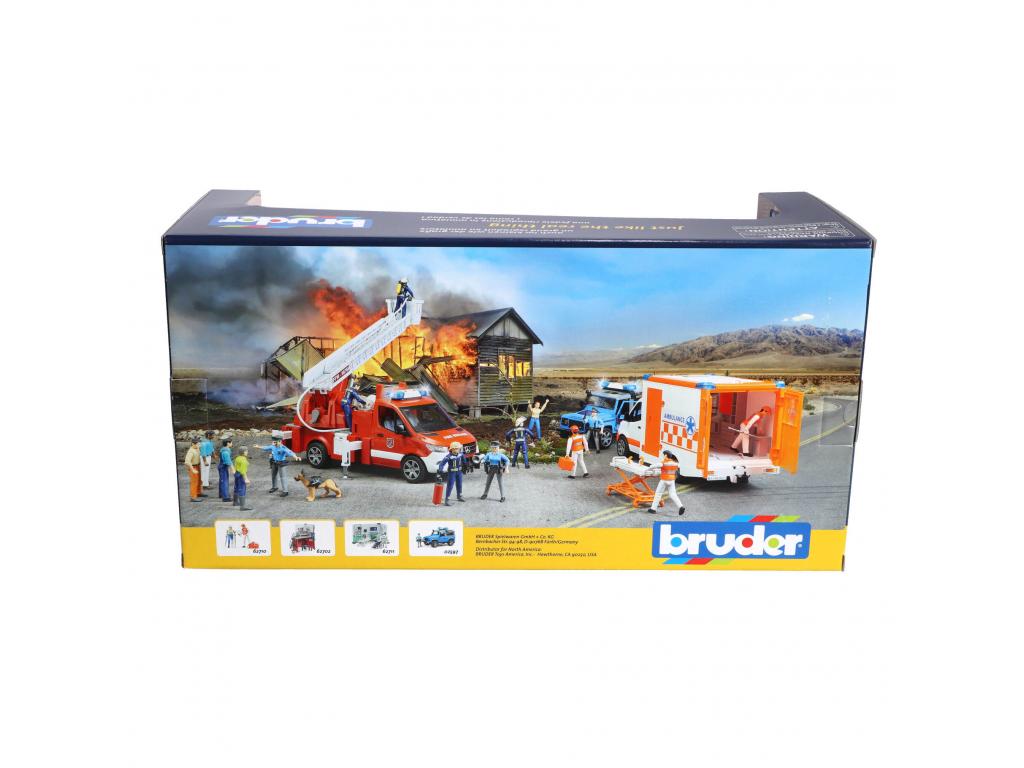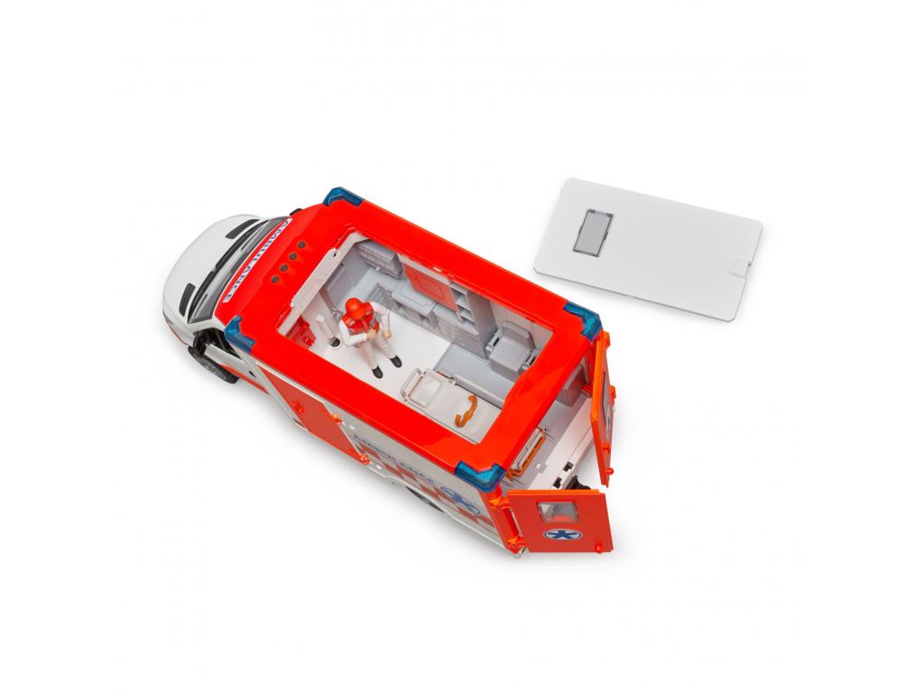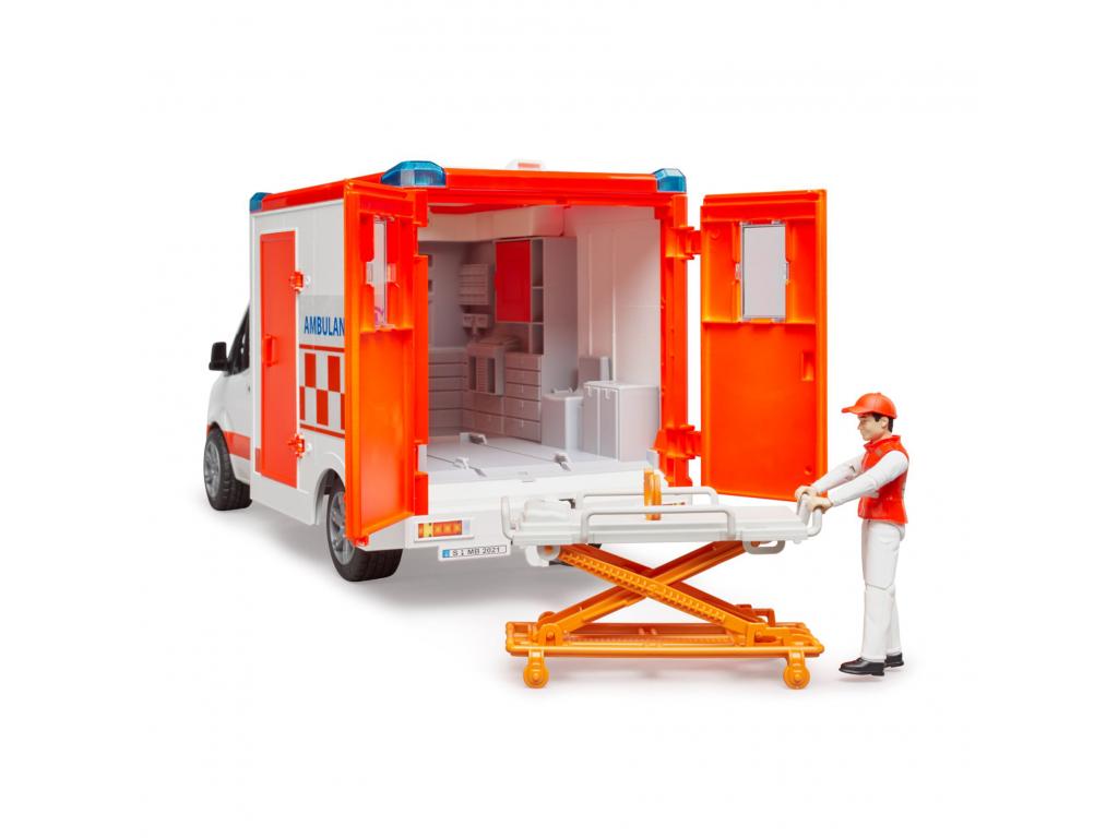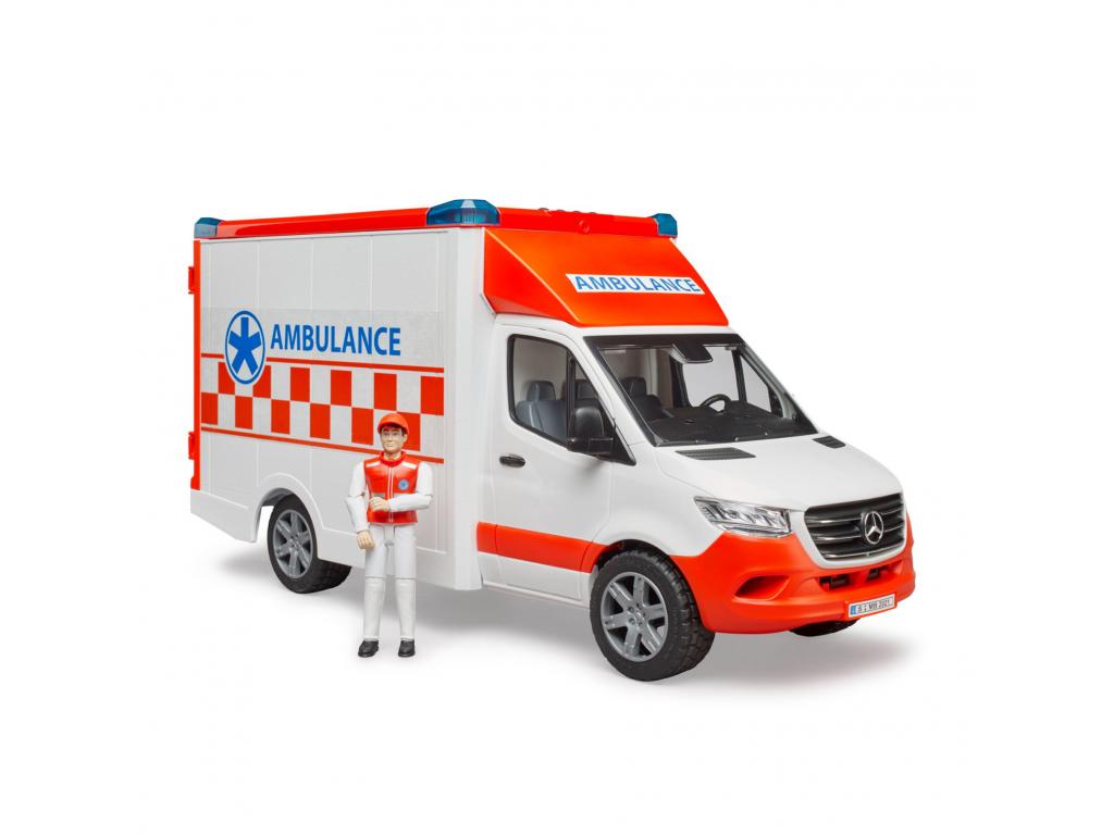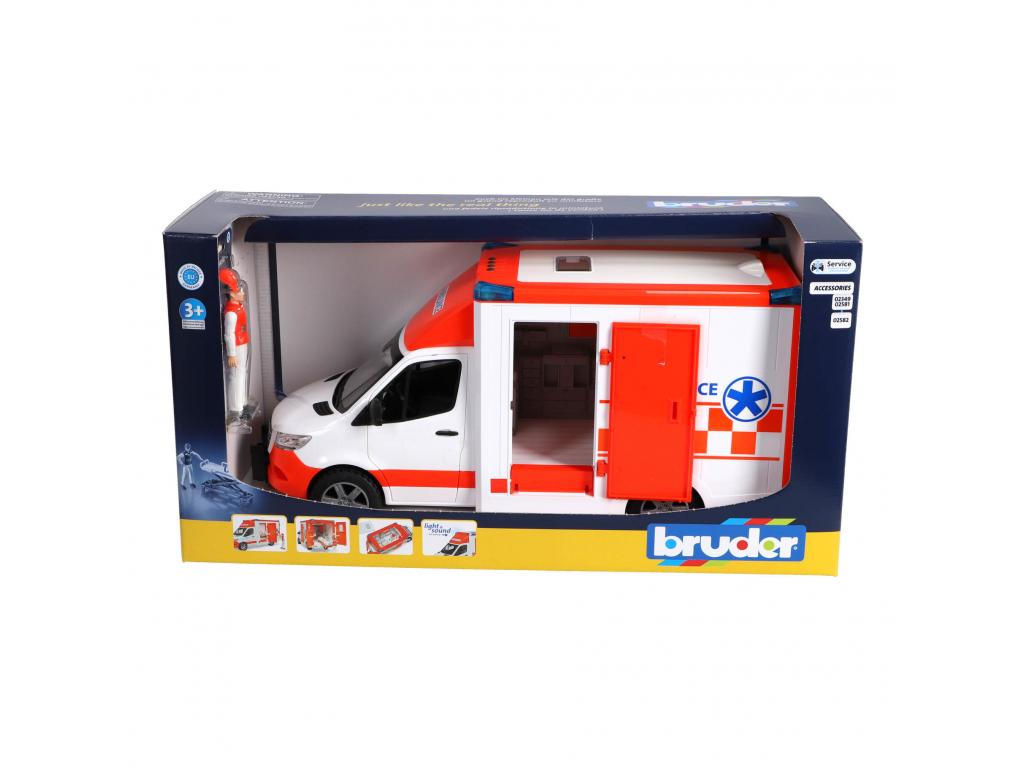 Bruder Mercedes Benz Sprinter mentőautó sofőrrel. Fény- és hangfunkcióval. A mentőautó mérete: 45,5 x 17 x 22 cm. 3 AAA elemmel működik, amelyek a csomagban megtalálhatók. Az ajtó nyitható és zárható. Ajánlott életkor: 4 év felett.