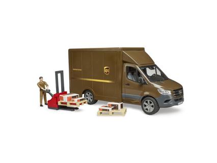 Bruder Mercedes Benz Sprinter UPS szállítójármű + figura és kiegészítők. Tartalom: 1 UPS Sprinter, 1 figura, kiegészítők (raklap, raklapemelő, UPS dobozok). A Sprinter ajtaja nyitható és zárható. Ajánlott életkor: 4 év felett.