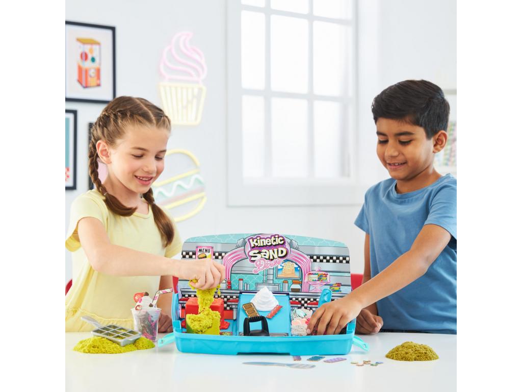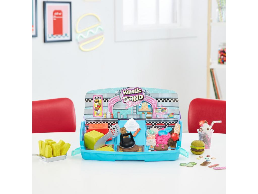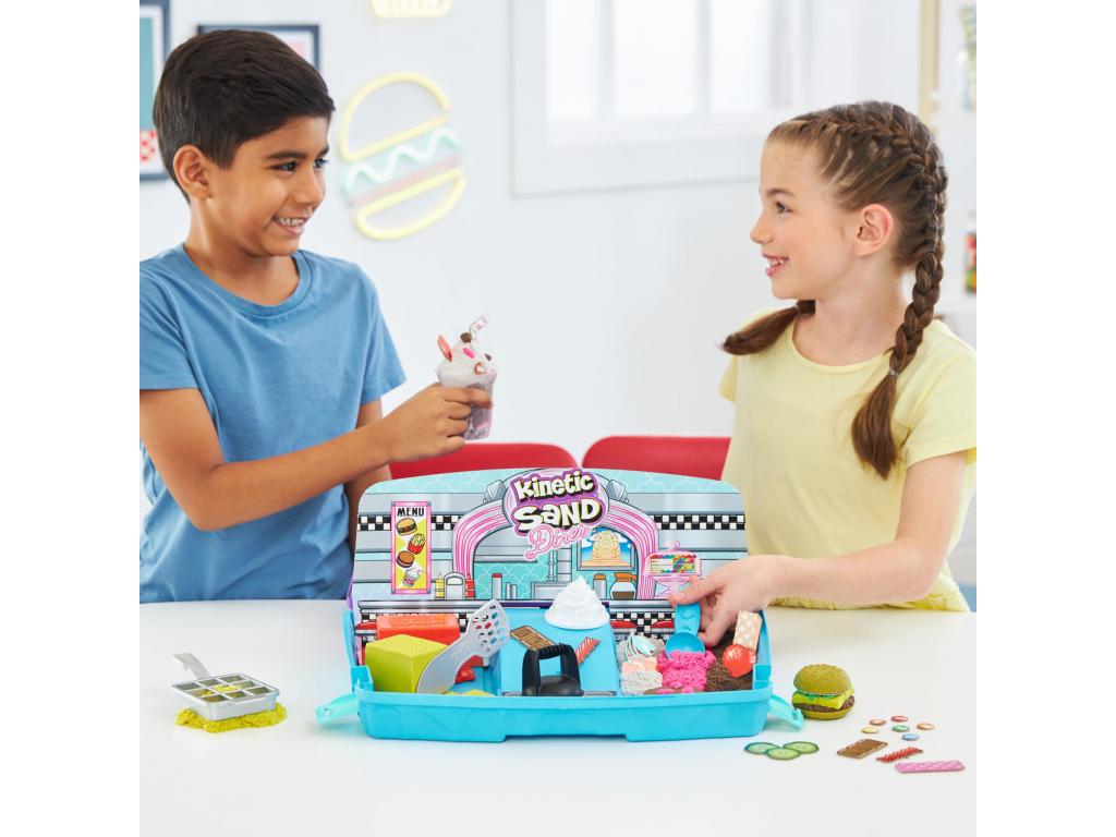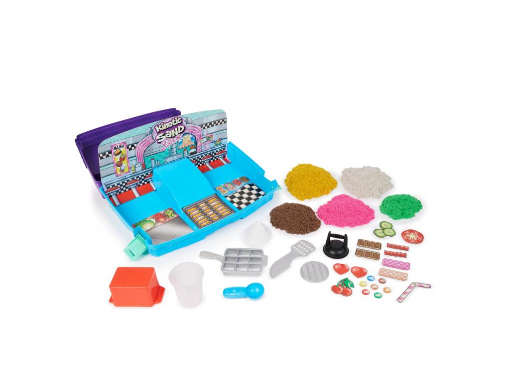 Hozd el az éttermi étkezés élményét otthonodba a Kinetic Sand Grill N' Scoop Dinerrel! Ez a játékszett 907 gramm Kinetic Sand homokkal és 27 konyhai eszközzel és kiegészítővel van ellátva, hogy végtelenül sokáig játszhass otthon. A gyerekek megtapasztalhatják az étkezés minden lépését, miközben formázzák a zsemlét, megsütik a hamburgert, felszeletelik a sajtot, reszelik a salátát és még sok mást, hogy elkészítsék a homokos hamburgert! Ezután jöhetnek a sült krumplik. Formázz, szeletelj és készíts puha sült krumplit! Mi lenne egy turmixszal? Keverd össze kedvenc ízeidet, és használd a habszivacs formát, hogy megkoronázd az egészet! Díszítsd alkotásaidat cukorkákkal, papírszívószállal és még sok mással! Annyiféleképpen lehet személyre szabni és alkotni. Ne felejtsd el összenyomkodni és újra játszani, hogy végtelenül sok ételkészítményt alkothass! Az összecsukható homokozó tárolóként és játszótérként is szolgál, így a takarítás is gyerekjáték. A Grill N' Scoop Diner 5 éves és annál idősebb gyermekek számára tökéletes, ösztönzi a kreativitást, a finom motorikus képességeket és az érzékszervek fejlődését.