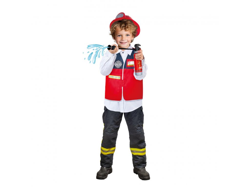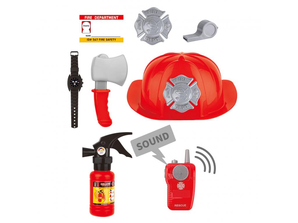 Teljes tűzoltó jelmez szett sisakkal, baltával, walkie-talkie-val és egyéb kiegészítőkkel. Műanyagból készült. 3 éves kortól alkalmas.
