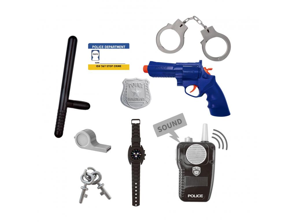 Rendőr jelmez kiegészítőkkel, többek között rendőrsapkával, walkie-talkie-val, bilincsekkel és egyebekkel. Tökéletes szerepjátékokhoz és jelmezbálokhoz.