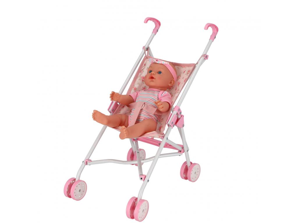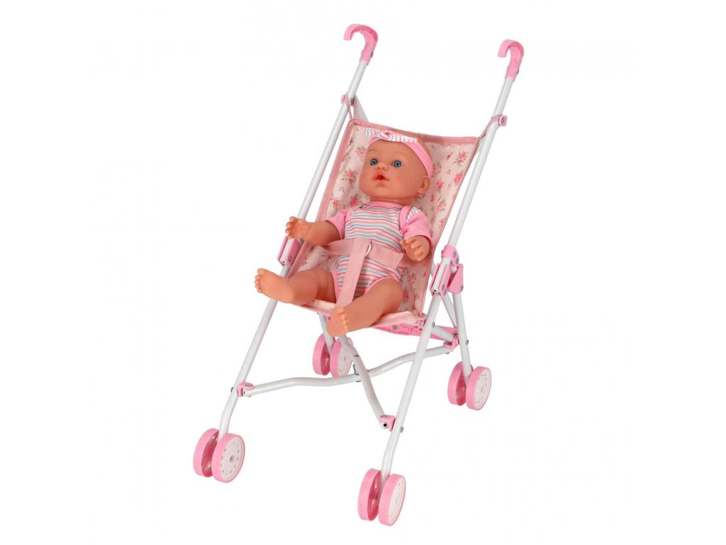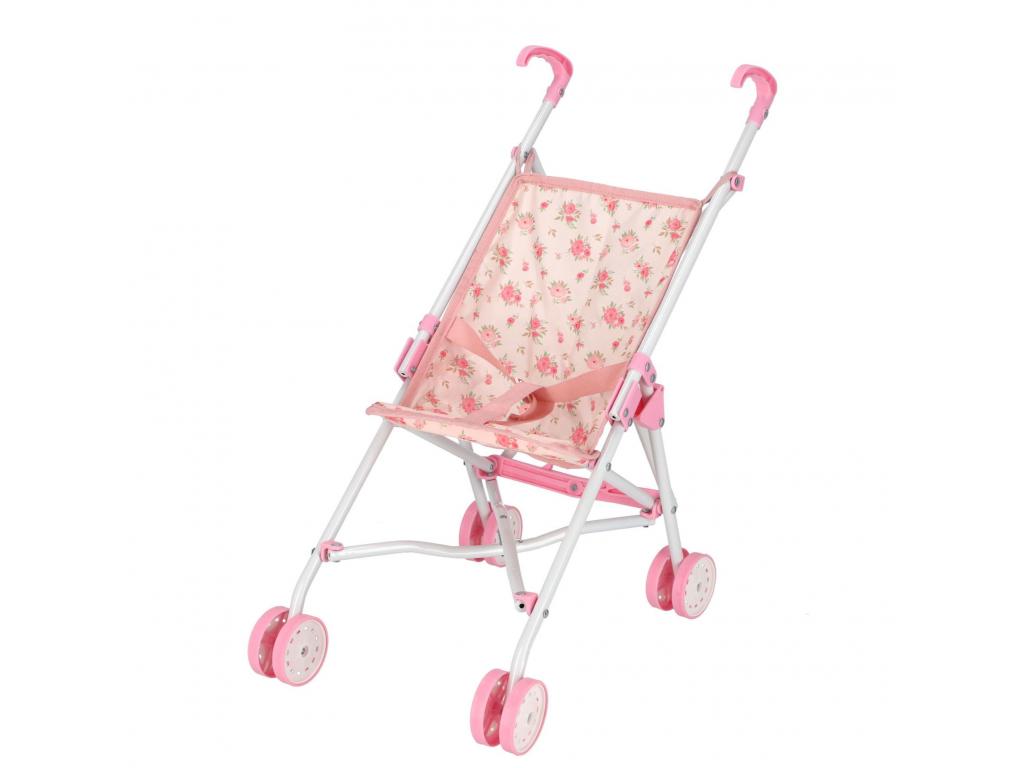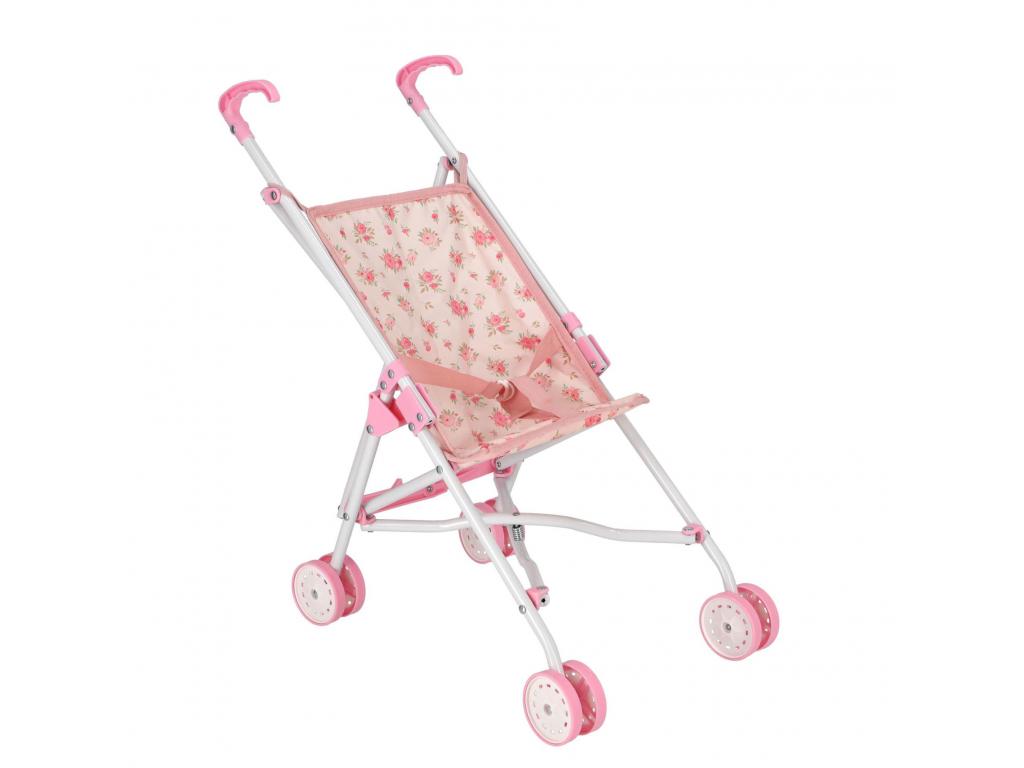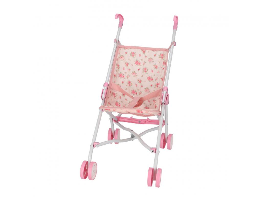 Egyszerű tolható babakocsi játékbabáknak rózsaszín virágos kivitelben. Körülbelül 43 cm-es babákhoz. 3 éves kortól alkalmas.