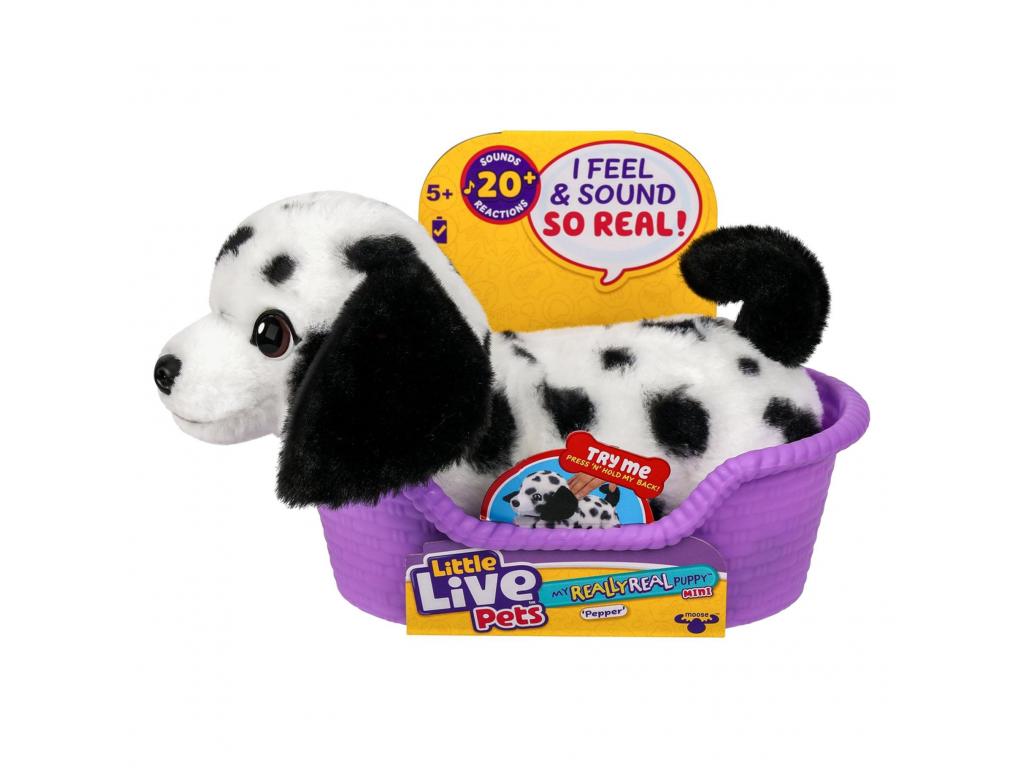 My Really Real Puppy Mini Pepper 21 cm-es plüss kiskutya interaktív funkciókkal. 3 éves kortól alkalmas. Puha szőre van, a legaranyosabb kiskutyaszemekkel, és több mint 20 hanggal reagál az érintésedre.