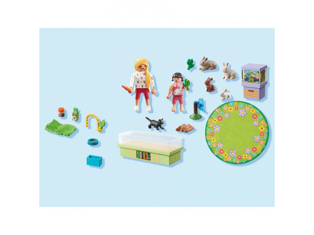 Playmobil 71753 szett nyúlcsaláddal és kiegészítőkkel. Több nyuszit és etetőhelyet tartalmaz. Kis méretű, ideális kiegészítő szettként vagy ajándékként. 4 éves kortól alkalmas.