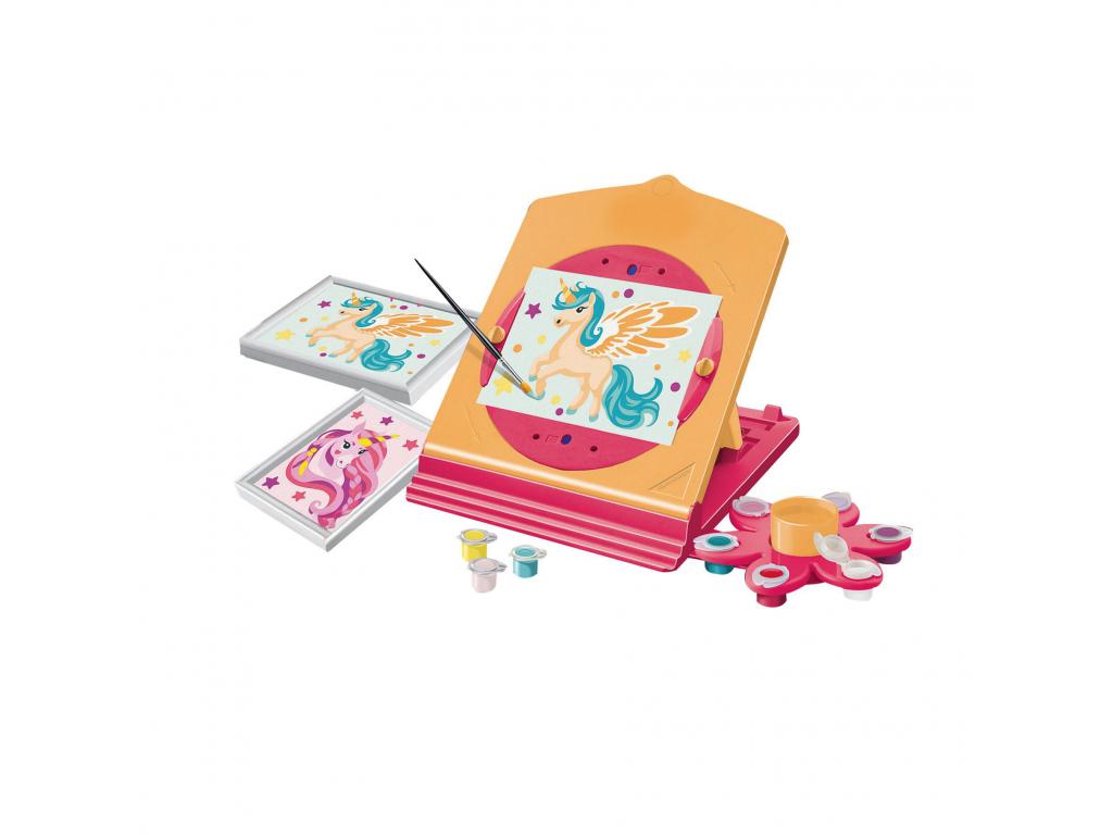 Komplett festés számok szerint készlet neon stílusban, műterem témával. Tartalmaz számozott vásznat, ecseteket és festéket. 7 éves kortól alkalmas.